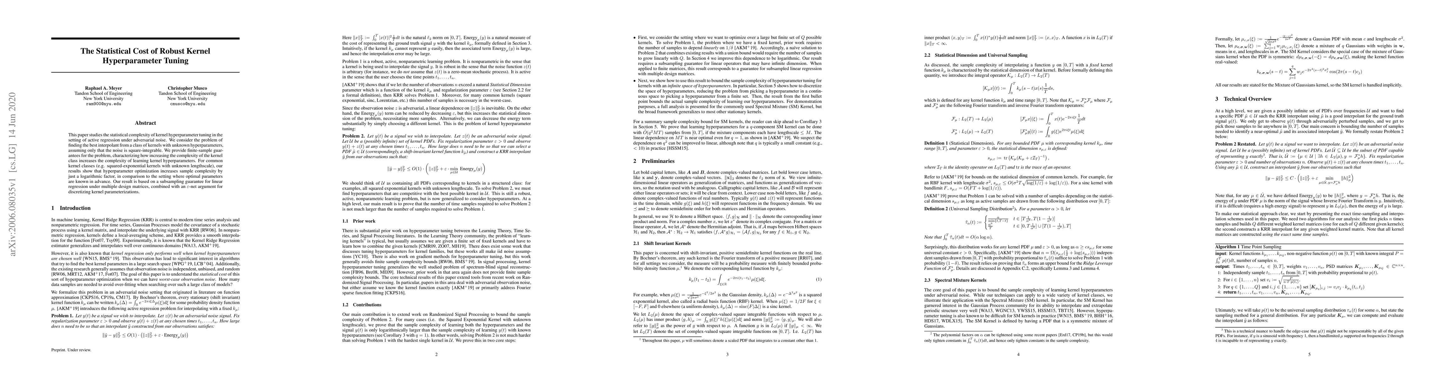 The paper shows that hyperparameter tuning for kernel methods increases sample complexity by a logarithmic factor compared to known optimal parameters, with implications for active regression under adversarial noise.