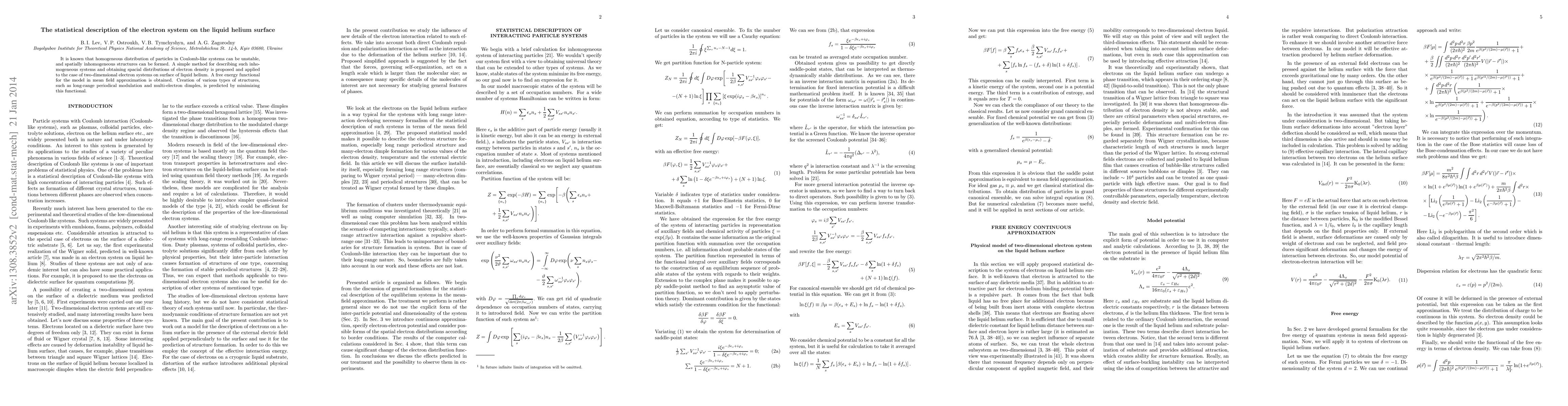 This paper proposes a method to describe inhomogeneous electron systems on the surface of liquid helium using a free energy functional in mean field approximation, predicting the formation of structures like long-range modulations and multi-electron dimples. The approach aims to understand the spatial distribution of electron density in two-dimensional systems.