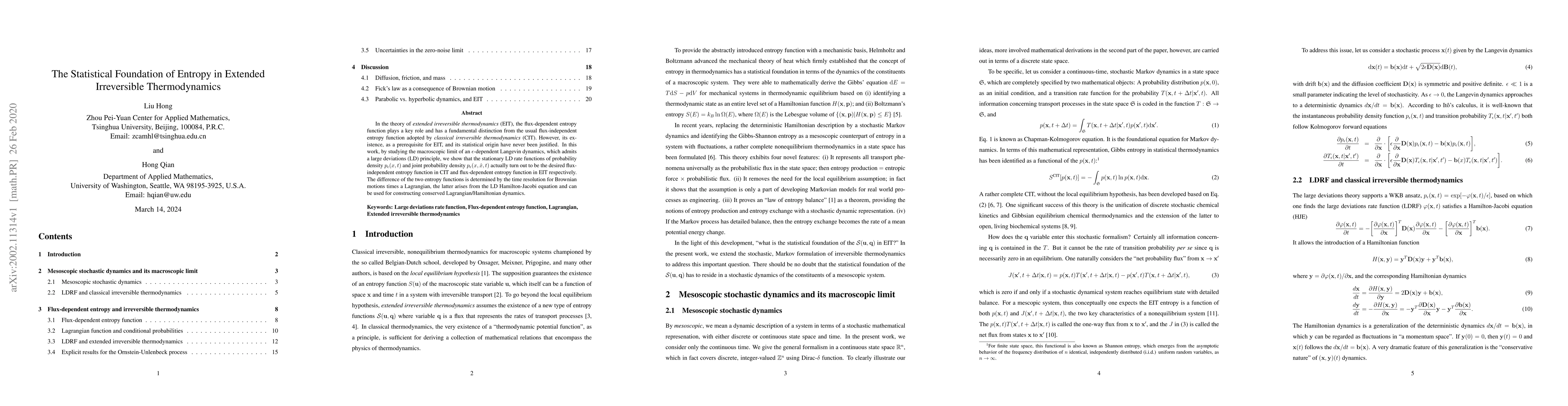 In the theory of extended irreversible thermodynamics (EIT), the flux-dependent entropy function plays a key role and has a fundamental distinction from the usual flux-independent entropy function adopted by classical irreversible thermodynamics (CIT). However, its existence, as a prerequisite for EIT, and its statistical origin have never been justified. In this work, by studying the macroscopic limit of an \epsilon-dependent Langevin dynamics, which admits a large deviations (LD) principle, we show that the stationary LD rate functions of probability density p_{\epsilon}(x; t) and joint probability density p_{\epsilon}(x; \dot{x}; t) actually turn out to be the desired fluxindependent entropy function in CIT and flux-dependent entropy function in EIT respectively. The difference of the two entropy functions is determined by the time resolution for Brownian motions times a Lagrangian, the latter arises from the LD Hamilton-Jacobi equation and can be used for constructing conserved Lagrangian/Hamiltonian dynamics.