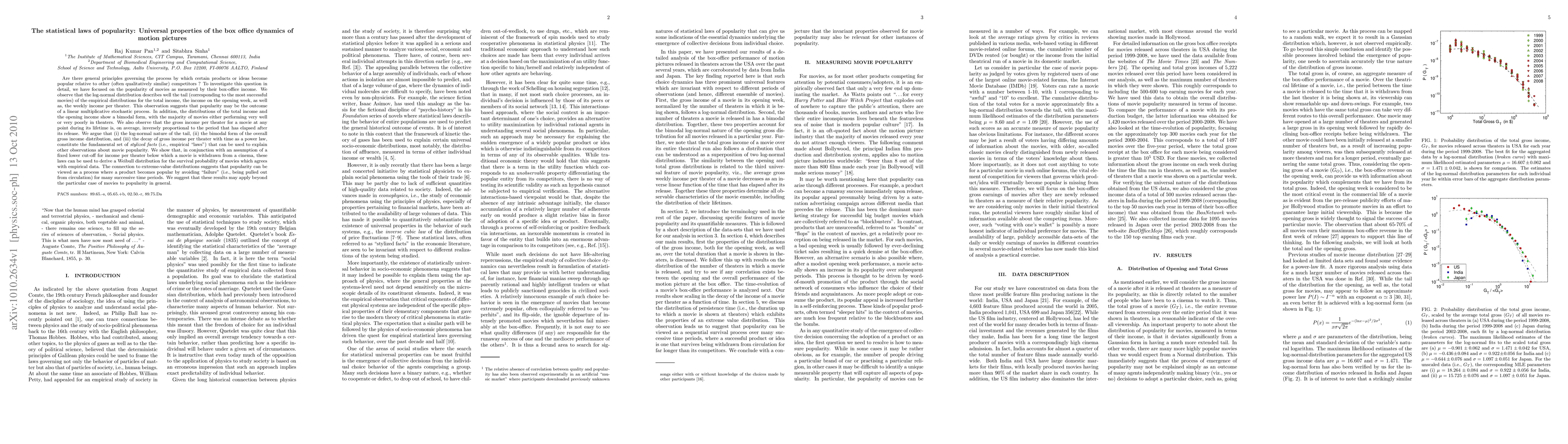 Are there general principles governing the process by which certain products or ideas become popular relative to other (often qualitatively similar) competitors? To investigate this question in detail, we have focused on the popularity of movies as measured by their box-office income. We observe that the log-normal distribution describes well the tail (corresponding to the most successful movies) of the empirical distributions for the total income, the income on the opening week, as well as, the weekly income per theater. This observation suggests that popularity may be the outcome of a linear multiplicative stochastic process. In addition, the distributions of the total income and the opening income show a bimodal form, with the majority of movies either performing very well or very poorly in theaters. We also observe that the gross income per theater for a movie at any point during its lifetime is, on average, inversely proportional to the period that has elapsed after its release. We argue that (i) the log-normal nature of the tail, (ii) the bimodal form of the overall gross income distribution, and (iii) the decay of gross income per theater with time as a power law, constitute the fundamental set of {\em stylized facts} (i.e., empirical "laws") that can be used to explain other observations about movie popularity. We show that, in conjunction with an assumption of a fixed lower cut-off for income per theater below which a movie is withdrawn from a cinema, these laws can be used to derive a Weibull distribution for the survival probability of movies which agrees with empirical data. The connection to extreme-value distributions suggests that popularity can be viewed as a process where a product becomes popular by avoiding failure (i.e., being pulled out from circulation) for many successive time periods. We suggest that these results may apply to popularity in general.
