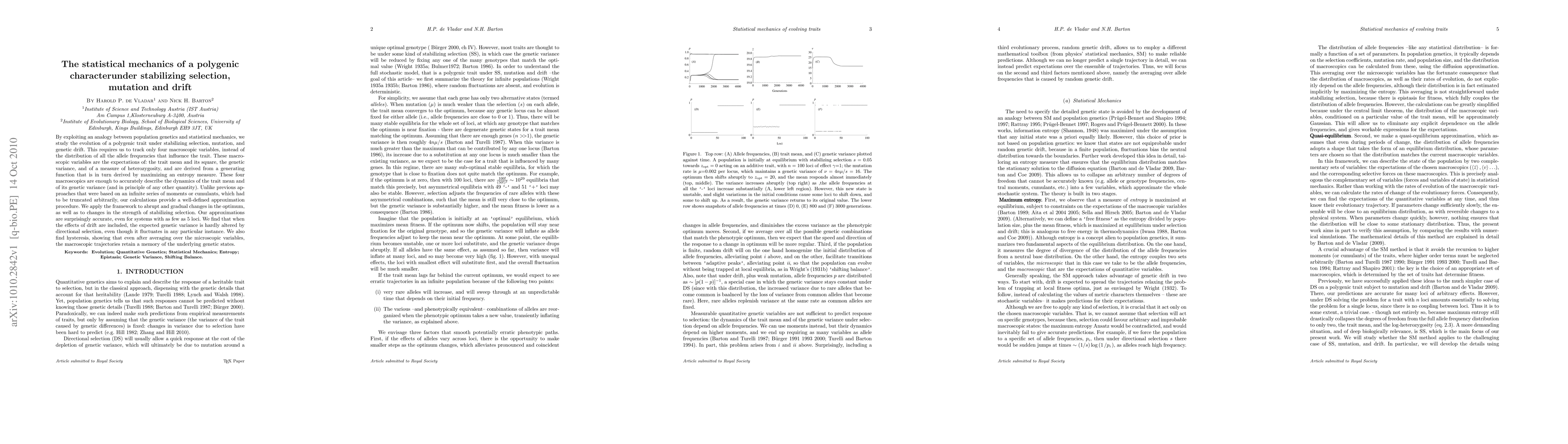 This paper uses statistical mechanics principles to model the evolution of polygenic traits under stabilizing selection, mutation, and genetic drift, focusing on four macroscopic variables: trait mean, its square, genetic variance, and heterozygosity. The approach provides an accurate approximation without truncation, revealing that genetic drift minimally affects genetic variance and demonstrating hysteresis in macroscopic trajectories.