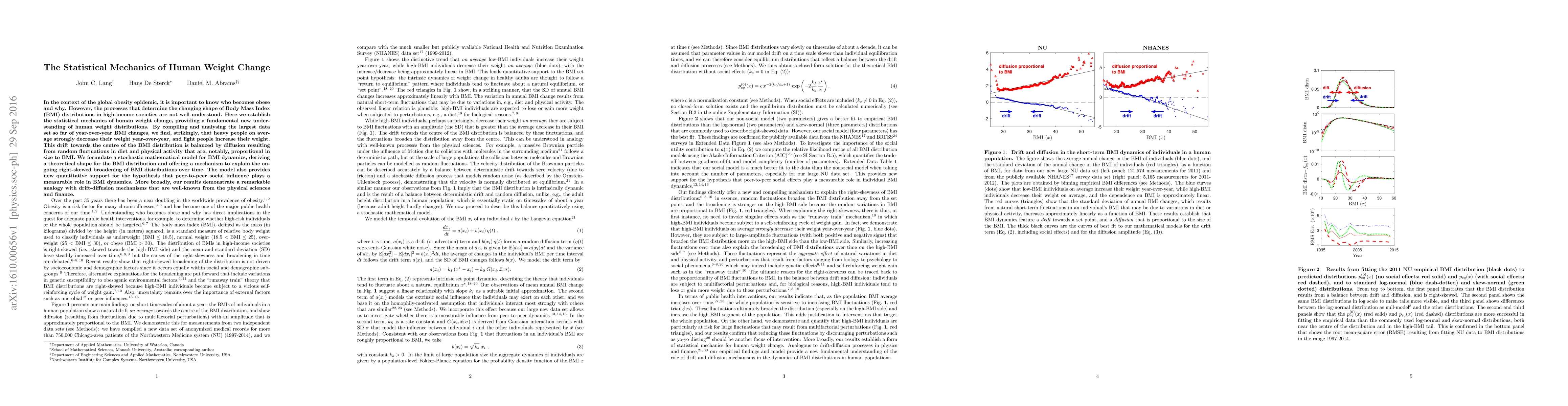 In the context of the global obesity epidemic, it is important to know who becomes obese and why. However, the processes that determine the changing shape of Body Mass Index (BMI) distributions in high-income societies are not well-understood. Here we establish the statistical mechanics of human weight change, providing a fundamental new understanding of human weight distributions. By compiling and analysing the largest data set so far of year-over-year BMI changes, we find, strikingly, that heavy people on average strongly decrease their weight year-over-year, and light people increase their weight. This drift towards the centre of the BMI distribution is balanced by diffusion resulting from random fluctuations in diet and physical activity that are, notably, proportional in size to BMI. We formulate a stochastic mathematical model for BMI dynamics, deriving a theoretical shape for the BMI distribution and offering a mechanism to explain the ongoing right-skewed broadening of BMI distributions over time. The model also provides new quantitative support for the hypothesis that peer-to-peer social influence plays a measurable role in BMI dynamics. More broadly, our results demonstrate a remarkable analogy with drift-diffusion mechanisms that are well-known from the physical sciences and finance.