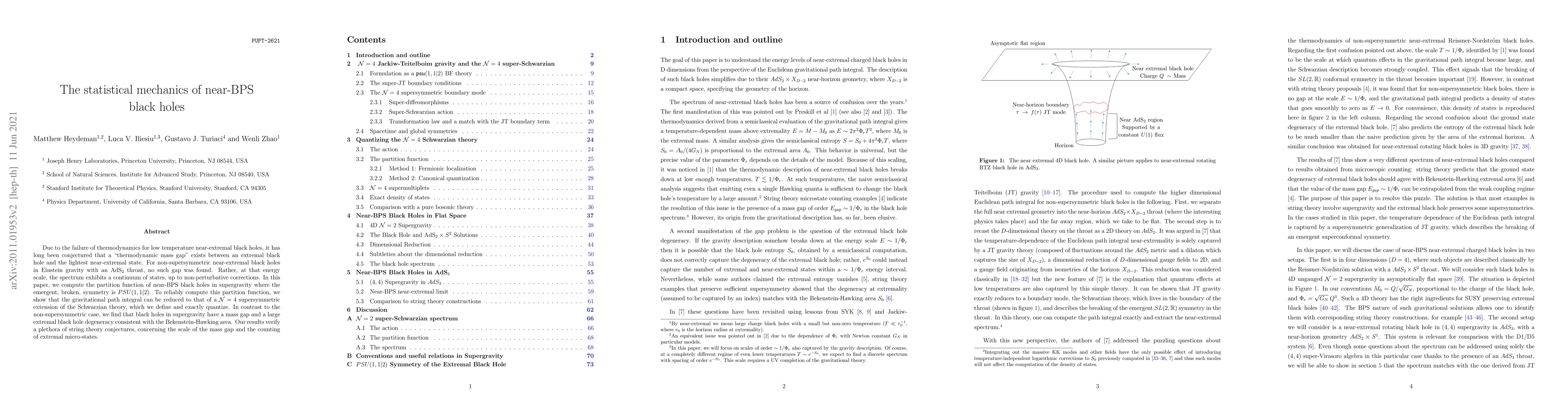 Due to the failure of thermodynamics for low temperature near-extremal black holes, it has long been conjectured that a "thermodynamic mass gap" exists between an extremal black hole and the lightest near-extremal state. For non-supersymmetric near-extremal black holes in Einstein gravity, with an AdS$_2$ throat, no such gap was found. Rather, at that energy scale, the spectrum exhibits a continuum of states, up to non-perturbative corrections. In this paper, we compute the partition function of near-BPS black holes in supergravity where the emergent, broken, symmetry is $PSU(1,1|2)$. To reliably compute this partition function, we show that the gravitational path integral can be reduced to that of a $\mathcal N=4$ supersymmetric extension of the Schwarzian theory, which we define and exactly quantize. In contrast to the non-supersymmetric case, we find that black holes in supergravity have a mass gap and a large extremal black hole degeneracy consistent with the Bekenstein-Hawking area. Our results verify several string theory conjectures, concerning the scale of the mass gap and the counting of extremal micro-states.