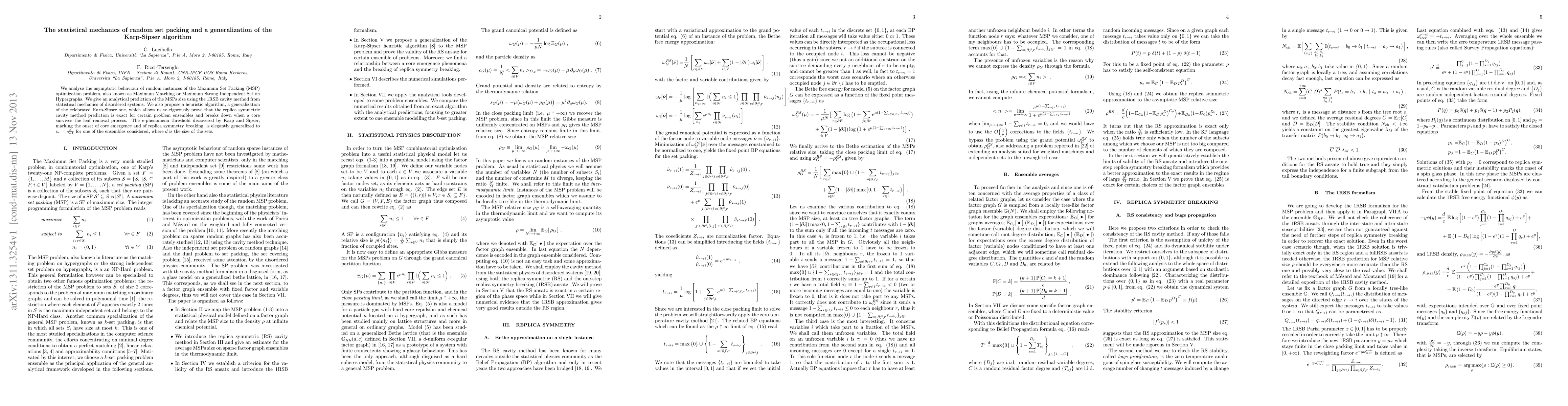 We analyse the asymptotic behaviour of random instances of the Maximum Set Packing (MSP) optimization problem, also known as Maximum Matching or Maximum Strong Independent Set on Hypergraphs. We give an analytical prediction of the MSPs size using the 1RSB cavity method from statistical mechanics of disordered systems. We also propose a heuristic algorithm, a generalization of the celebrated Karp-Sipser one, which allows us to rigorously prove that the replica symmetric cavity method prediction is exact for certain problem ensembles and breaks down when a core survives the leaf removal process. The $e$-phenomena threshold discovered by Karp and Sipser, marking the onset of core emergence and of replica symmetry breaking, is elegantly generalized to $c_s = \frac{e}{d-1}$ for one of the ensembles considered, where $d$ is the size of the sets.