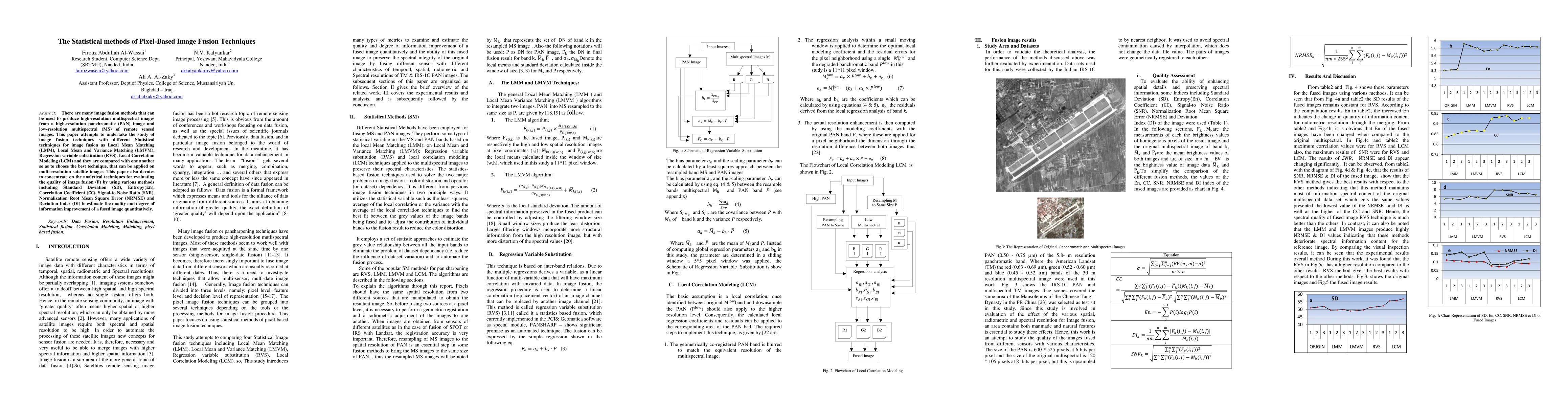 This paper investigates various pixel-based image fusion techniques, including Local Mean Matching, Local Mean and Variance Matching, Regression variable substitution, and Local Correlation Modeling, and evaluates their performance using statistical methods like Standard Deviation, Entropy, and Signal-to-Noise Ratio to determine the best method for multi-resolution satellite images.