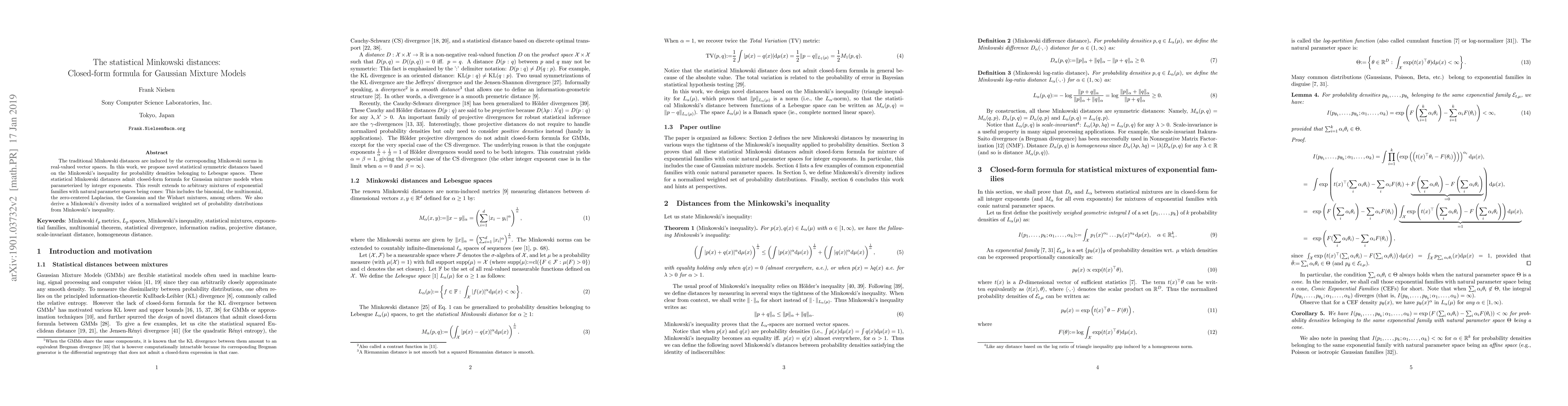This paper introduces new statistical Minkowski distances that can be used to analyze Gaussian mixture models with closed-form formulas for arbitrary mixtures of exponential families. These distances offer a novel approach to measure diversity in probability distributions.