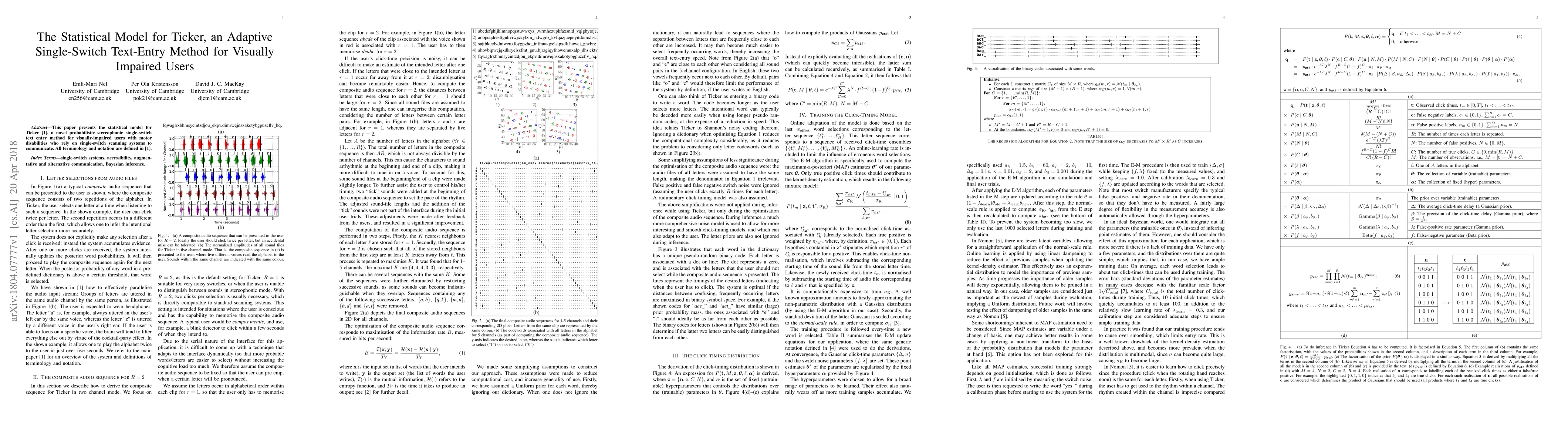 This research introduces a statistical model for Ticker, a new single-switch text entry method designed to help visually impaired users communicate more effectively. The approach uses probabilistic techniques to improve accuracy and ease of use for users with motor disabilities.