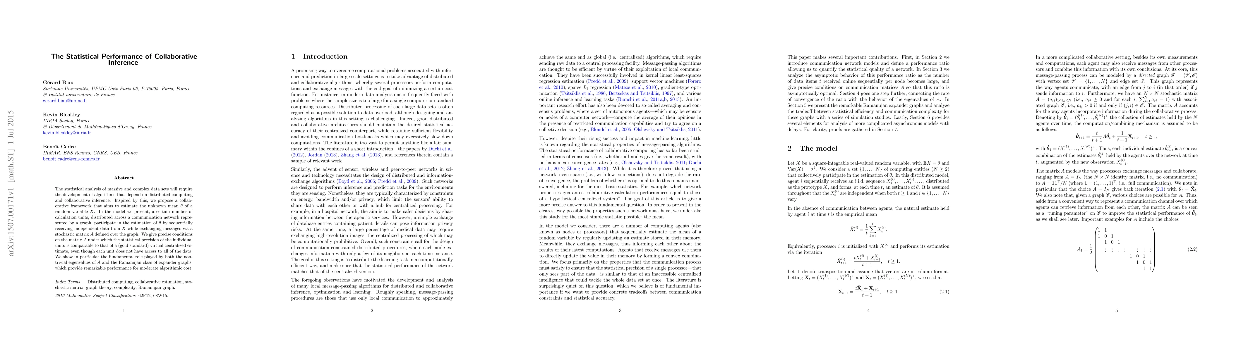 The statistical analysis of massive and complex data sets will require the development of algorithms that depend on distributed computing and collaborative inference. Inspired by this, we propose a collaborative framework that aims to estimate the unknown mean $\theta$ of a random variable $X$. In the model we present, a certain number of calculation units, distributed across a communication network represented by a graph, participate in the estimation of $\theta$ by sequentially receiving independent data from $X$ while exchanging messages via a stochastic matrix $A$ defined over the graph. We give precise conditions on the matrix $A$ under which the statistical precision of the individual units is comparable to that of a (gold standard) virtual centralized estimate, even though each unit does not have access to all of the data. We show in particular the fundamental role played by both the non-trivial eigenvalues of $A$ and the Ramanujan class of expander graphs, which provide remarkable performance for moderate algorithmic cost.