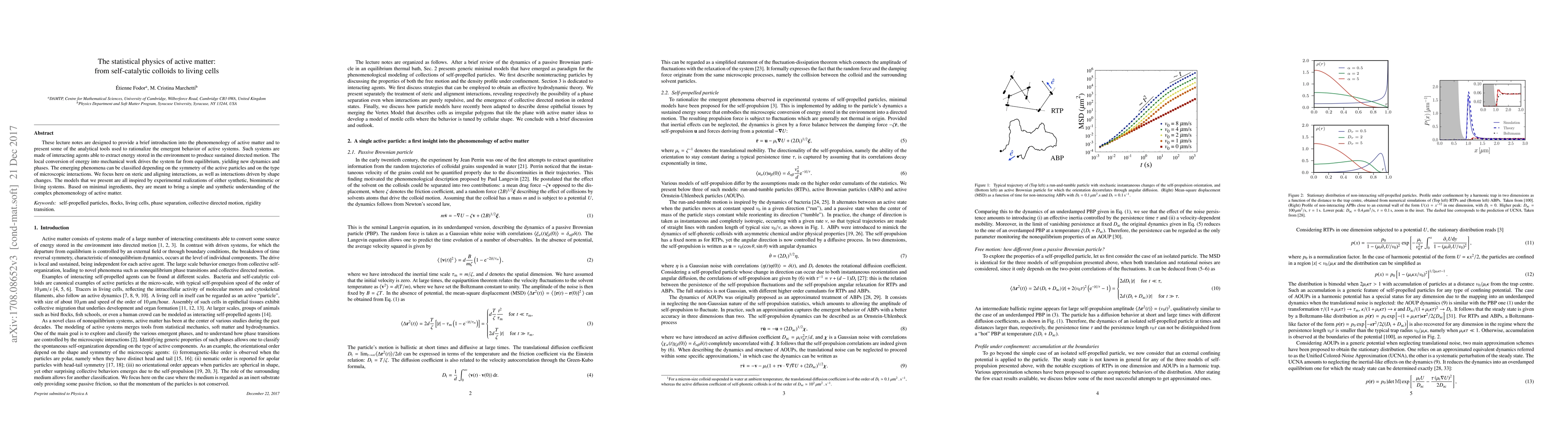 This paper introduces the statistical physics of active matter, focusing on systems like self-catalytic colloids and living cells that convert environmental energy into mechanical work. It discusses analytical tools to understand emergent behaviors and classifies phenomena based on particle symmetry and interaction types, emphasizing steric, aligning, and shape-driven interactions.