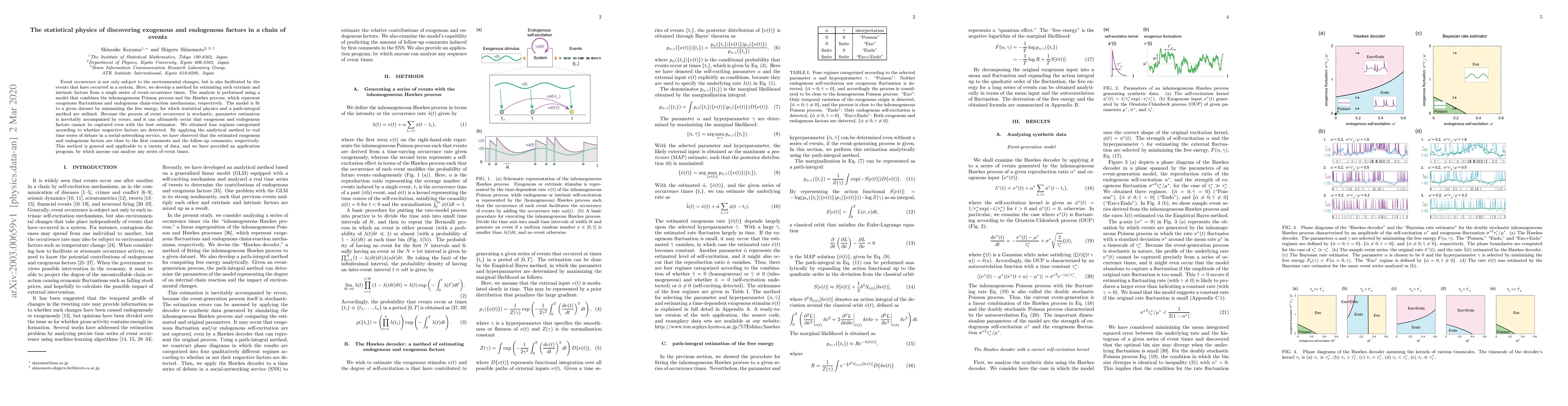 Event occurrence is not only subject to the environmental changes, but is also facilitated by the events that have occurred in a system. Here, we develop a method for estimating such extrinsic and intrinsic factors from a single series of event-occurrence times. The analysis is performed using a model that combines the inhomogeneous Poisson process and the Hawkes process, which represent exogenous fluctuations and endogenous chain-reaction mechanisms, respectively. The model is fit to a given dataset by minimizing the free energy, for which statistical physics and a path-integral method are utilized. Because the process of event occurrence is stochastic, parameter estimation is inevitably accompanied by errors, and it can ultimately occur that exogenous and endogenous factors cannot be captured even with the best estimator. We obtained four regimes categorized according to whether respective factors are detected. By applying the analytical method to real time series of debate in a social-networking service, we have observed that the estimated exogenous and endogenous factors are close to the first comments and the follow-up comments, respectively. This method is general and applicable to a variety of data, and we have provided an application program, by which anyone can analyze any series of event times.