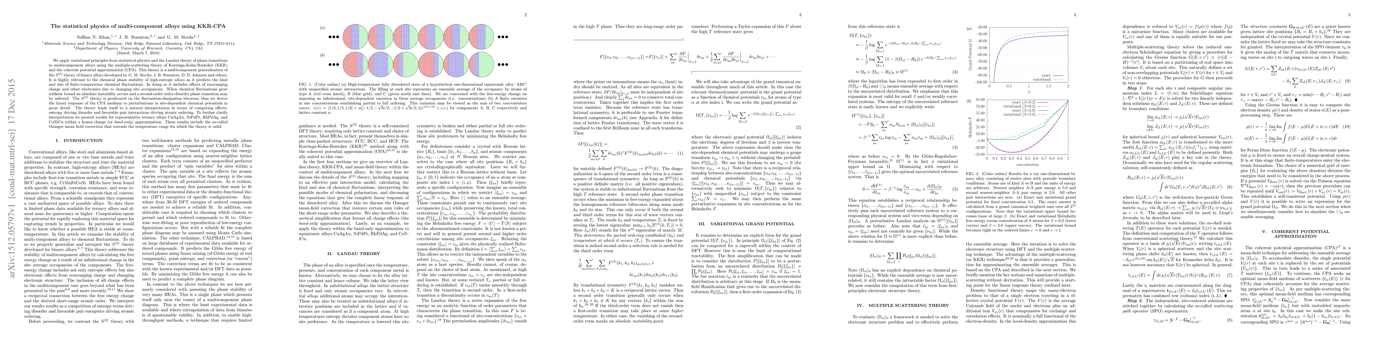 We apply variational principles from statistical physics and the Landau theory of phase transitions to multicomponent alloys using the multiple-scattering theory of Korringa-Kohn-Rostoker (KKR) and the coherent potential approximation (CPA). This theory is a multicomponent generalization of the $S^{(2)}$ theory of binary alloys developed by G. M. Stocks, J. B. Staunton, D. D. Johnson and others. It is highly relevant to the chemical phase stability of high-entropy alloys as it predicts the kind and size of finite-temperature chemical fluctuations. In doing so it includes effects of rearranging charge and other electronics due to changing site occupancies. When chemical fluctuations grow without bound an absolute instability occurs and a second-order order-disorder phase transition may be inferred. The S$^{(2)}$ theory is predicated on the fluctuation-dissipation theorem; thus we derive the linear response of the CPA medium to perturbations in site-dependent chemical potentials in great detail. The theory lends itself to a natural interpretation in terms of competing effects: entropy driving disorder and favorable pair interactions driving atomic ordering. To further clarify interpretation we present results for representative ternary alloys CuAgAu, NiPdPt, RhPdAg, and CoNiCu within a frozen charge (or band-only) approximation. These results include the so-called Onsager mean field correction that extends the temperature range for which the theory is valid.