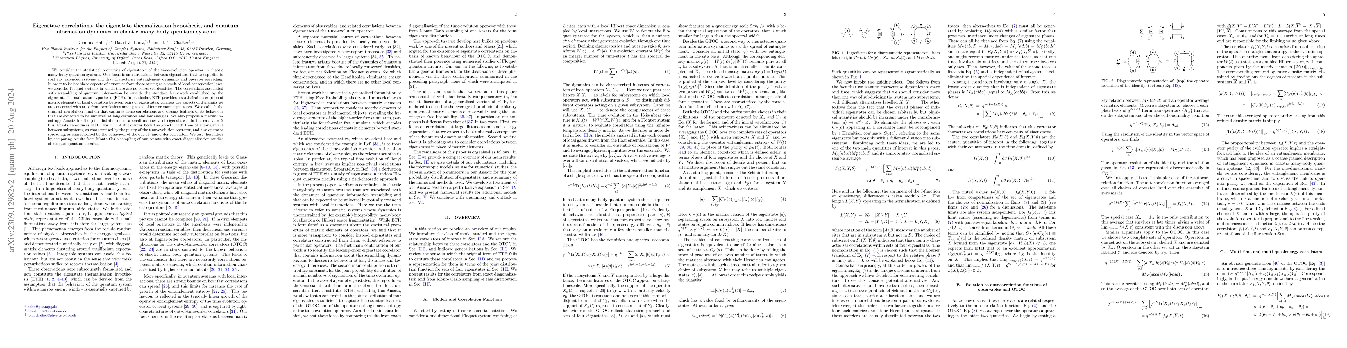 We consider the statistical properties of eigenstates of the time-evolution operator in chaotic many-body quantum systems. Our focus is on correlations between eigenstates that are specific to spatially extended systems and that characterise entanglement dynamics and operator spreading. In order to isolate these aspects of dynamics from those arising as a result of local conservation laws, we consider Floquet systems in which there are no conserved densities. The correlations associated with scrambling of quantum information lie outside the standard framework established by the eigenstate thermalisation hypothesis (ETH). In particular, ETH provides a statistical description of matrix elements of local operators between pairs of eigenstates, whereas the aspects of dynamics we are concerned with arise from correlations amongst sets of four or more eigenstates. We establish the simplest correlation function that captures these correlations and discuss features of its behaviour that are expected to be universal at long distances and low energies. We also propose a maximum-entropy Ansatz for the joint distribution of a small number $n$ of eigenstates. In the case $n = 2$ this Ansatz reproduces ETH. For $n = 4$ it captures both the growth with time of entanglement between subsystems, as characterised by the purity of the time-evolution operator, and also operator spreading, as characterised by the behaviour of the out-of-time-order correlator. We test these ideas by comparing results from Monte Carlo sampling of our Ansatz with exact diagonalisation studies of Floquet quantum circuits.