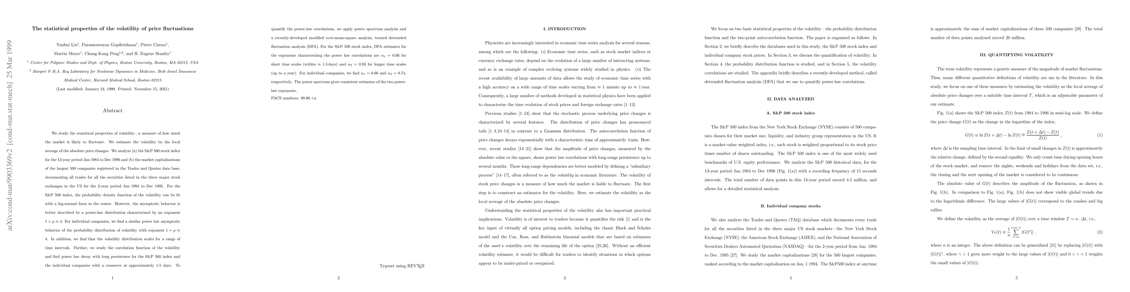 We study the statistical properties of volatility---a measure of how much the market is likely to fluctuate. We estimate the volatility by the local average of the absolute price changes. We analyze (a) the S&P 500 stock index for the 13-year period Jan 1984 to Dec 1996 and (b) the market capitalizations of the largest 500 companies registered in the Trades and Quotes data base, documenting all trades for all the securities listed in the three major stock exchanges in the US for the 2-year period Jan 1994 to Dec 1995. For the S&P 500 index, the probability density function of the volatility can be fit with a log-normal form in the center. However, the asymptotic behavior is better described by a power-law distribution characterized by an exponent 1 + \mu \approx 4. For individual companies, we find a power law asymptotic behavior of the probability distribution of volatility with exponent 1 + \mu \approx 4, similar to the S&P 500 index. In addition, we find that the volatility distribution scales for a range of time intervals. Further, we study the correlation function of the volatility and find power law decay with long persistence for the S&P 500 index and the individual companies with a crossover at approximately 1.5 days. To quantify the power-law correlations, we apply power spectrum analysis and a recently-developed modified root-mean-square analysis, termed detrended fluctuation analysis (DFA). For the S&P 500 index, DFA estimates for the exponents characterizing the power law correlations are \alpha_1=0.66 for short time scales (within \approx 1.5 days) and \alpha_2=0.93 for longer time scales (up to a year). For individual companies, we find \alpha_1=0.60 and \alpha_2=0.74, respectively. The power spectrum gives consistent estimates of the two power-law exponents.