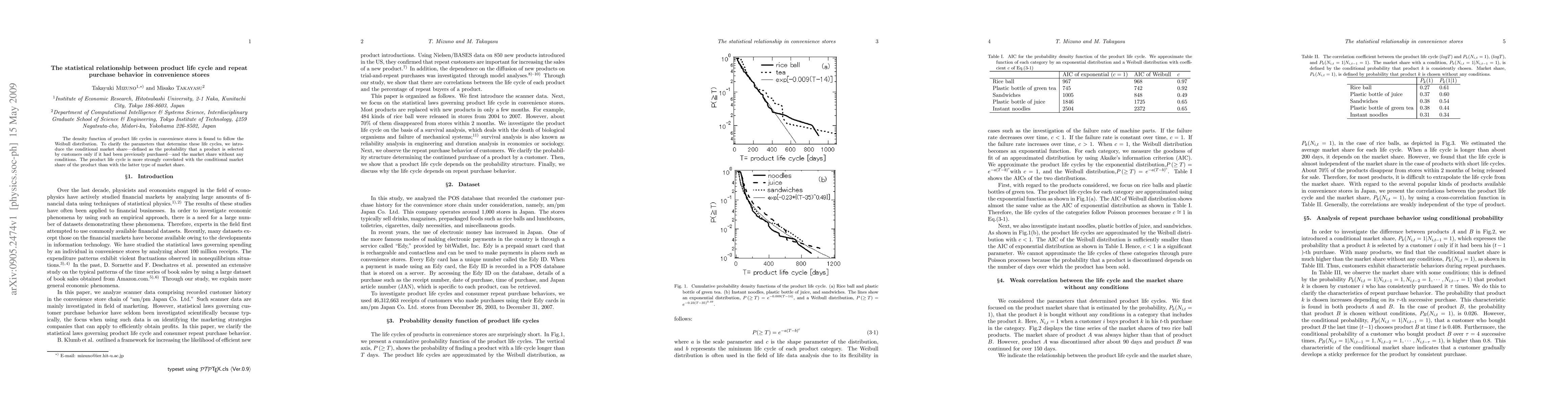 A study found that product life cycles in convenience stores follow a Weibull distribution, with conditional market share being more strongly correlated with repeat purchase behavior than overall market share.
