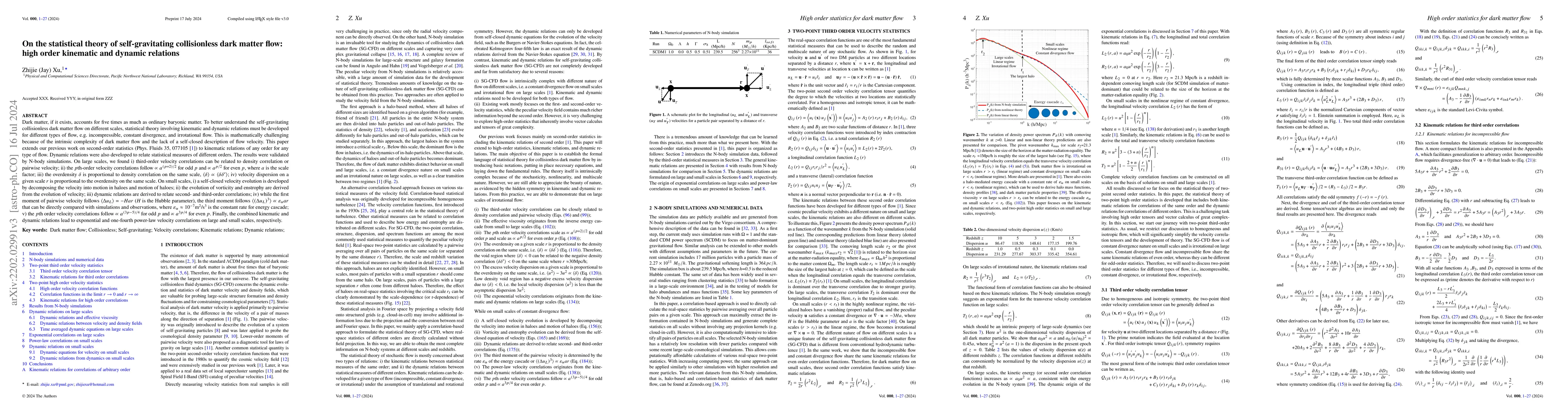 Statistical theory for self-gravitating collisionless dark matter flow is not fully developed because of 1) intrinsic complexity involving constant divergence flow on small scale and irrotational flow on large scale; 2) lack of self-closed description for peculiar velocity; and 3) mathematically challenging. To better understand dark matter flow, kinematic and dynamic relations must be developed for different types of flow. In this paper, a compact derivation is presented to formulate general kinematic relations of any order for incompressible, constant divergence, and irrotational flow. Results are validated by N-body simulation. Dynamic relations can only be determined from self-closed description of velocity evolution. On large scale, we found i) third order velocity correlation can be related to density correlation or pairwise velocity; ii) effective viscosity in adhesion model originates from velocity fluctuations; iii) negative viscosity is due to inverse energy cascade; iv) $q$th order velocity correlations follow $\propto a^{(q+2)/2}$ for odd $q$ and $\propto a^{q/2}$ for even $q$; v) overdensity is proportional to density correlation on the same scale, $\langle\delta\rangle\propto\langle\delta\delta'\rangle$; vi) (reduced) velocity dispersion is proportional to density correlation on the same scale. On small scale, self-closed description for velocity evolution is developed by decomposing velocity into motion in halo and motion of halos. Vorticity, enstrophy, and energy evolution can all be derived subsequently. Dynamic relation is derived to relate second and third order correlations. Third moment of pairwise velocity is determined by energy cascade rate $\epsilon_u$ or $\langle(\Delta u_L)^3\rangle\propto\epsilon_uar$. Combined kinematic and dynamic relations determines the exponential and one-fourth power law velocity correlations on large and small scales, respectively.
