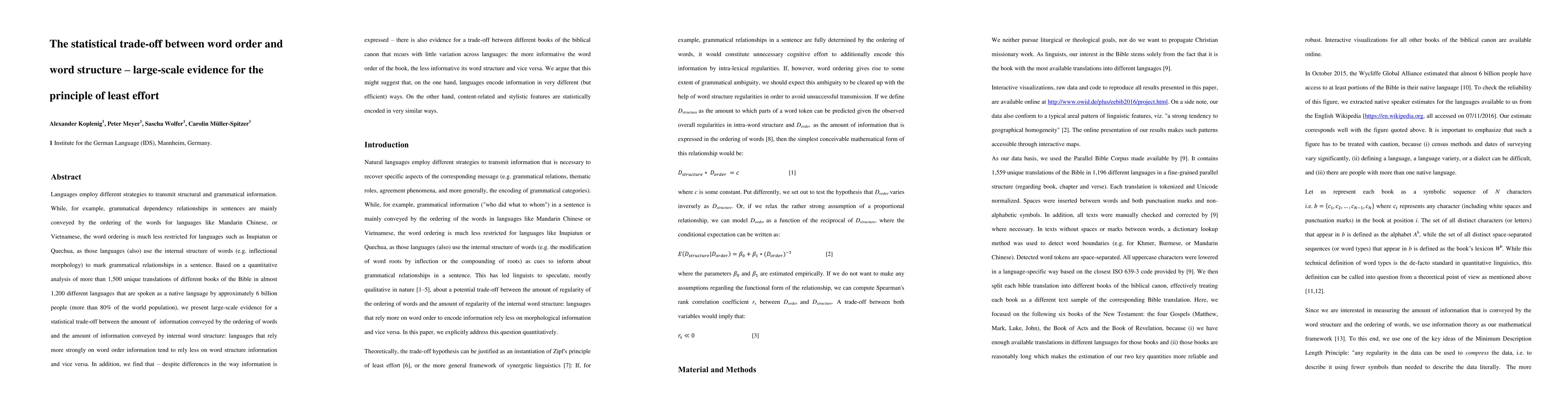 Languages employ different strategies to transmit structural and grammatical information. While, for example, grammatical dependency relationships in sentences are mainly conveyed by the ordering of the words for languages like Mandarin Chinese, or Vietnamese, the word ordering is much less restricted for languages such as Inupiatun or Quechua, as those languages (also) use the internal structure of words (e.g. inflectional morphology) to mark grammatical relationships in a sentence. Based on a quantitative analysis of more than 1,500 unique translations of different books of the Bible in more than 1,100 different languages that are spoken as a native language by approximately 6 billion people (more than 80% of the world population), we present large-scale evidence for a statistical trade-off between the amount of information conveyed by the ordering of words and the amount of information conveyed by internal word structure: languages that rely more strongly on word order information tend to rely less on word structure information and vice versa. In addition, we find that - despite differences in the way information is expressed - there is also evidence for a trade-off between different books of the biblical canon that recurs with little variation across languages: the more informative the word order of the book, the less informative its word structure and vice versa. We argue that this might suggest that, on the one hand, languages encode information in very different (but efficient) ways. On the other hand, content-related and stylistic features are statistically encoded in very similar ways.