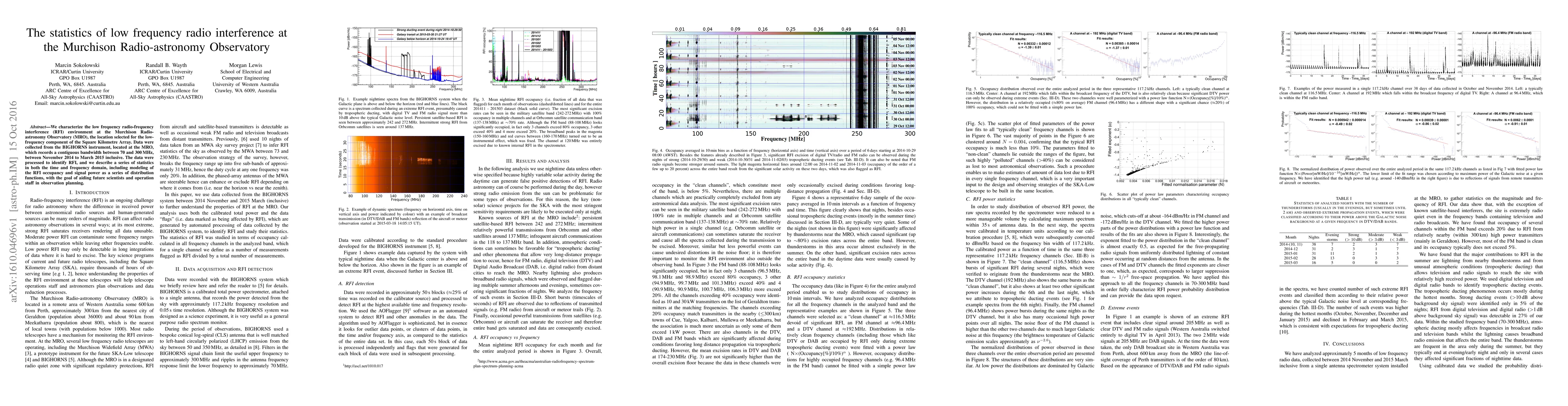 We characterize the low frequency radio-frequency interference (RFI) environment at the Murchison Radio-astronomy Observatory (MRO), the location selected for the low-frequency component of the Square Kilometre Array. Data were collected from the BIGHORNS instrument, located at the MRO, which records a contiguous bandwidth between 70 and 300 MHz, between November 2014 to March 2015 inclusive. The data were processed to identify RFI, and we describe a series of statistics in both the time and frequency domain, including modeling of the RFI occupancy and signal power as a series of distribution functions, with the goal of aiding future scientists and operation staff in observation planning.