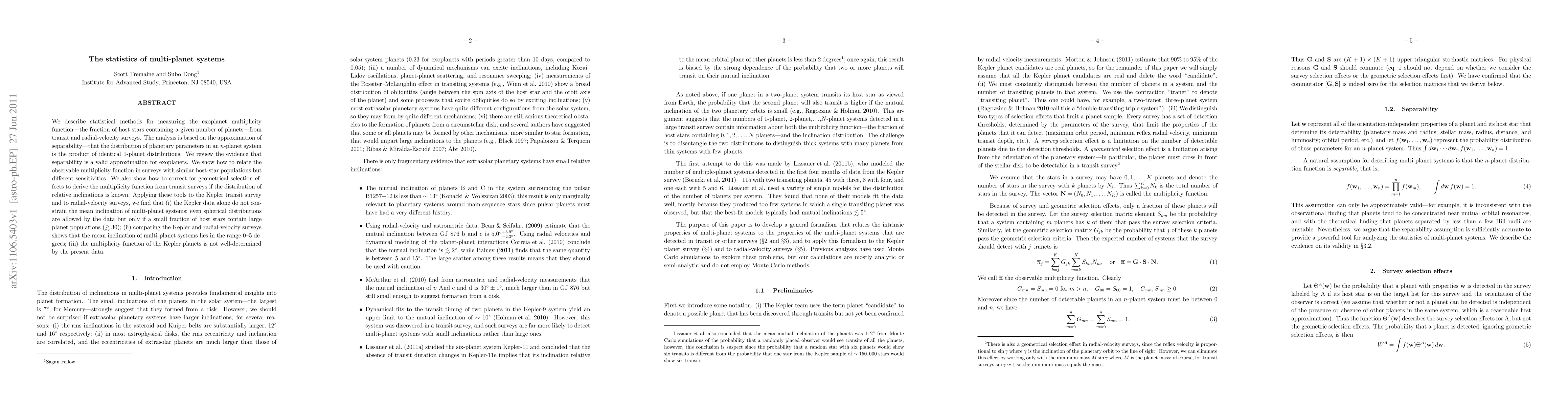 We describe statistical methods for measuring the exoplanet multiplicity function - the fraction of host stars containing a given number of planets - from transit and radial-velocity surveys. The analysis is based on the approximation of separability - that the distribution of planetary parameters in an n-planet system is the product of identical 1-planet distributions. We review the evidence that separability is a valid approximation for exoplanets. We show how to relate the observable multiplicity function in surveys with similar host-star populations but different sensitivities. We also show how to correct for geometrical selection effects to derive the multiplicity function from transit surveys if the distribution of relative inclinations is known. Applying these tools to the Kepler transit survey and radial-velocity surveys, we find that (i) the Kepler data alone do not constrain the mean inclination of multi-planet systems; even spherical distributions are allowed by the data but only if a small fraction of host stars contain large planet populations (> 30); (ii) comparing the Kepler and radial-velocity surveys shows that the mean inclination of multi-planet systems lies in the range 0-5 degrees; (iii) the multiplicity function of the Kepler planets is not well-determined by the present data.