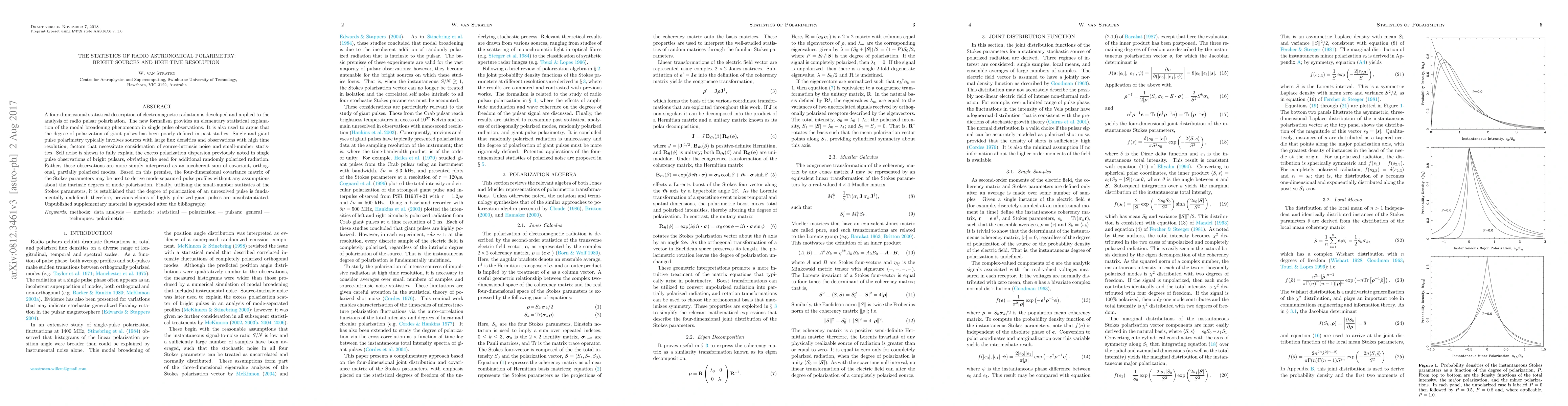A four-dimensional statistical description of electromagnetic radiation is developed and applied to the analysis of radio pulsar polarization. The new formalism provides an elementary statistical explanation of the modal broadening phenomenon in single pulse observations. It is also used to argue that the degree of polarization of giant pulses has been poorly defined in past studies. Single and giant pulse polarimetry typically involves sources with large flux densities and observations with high time resolution, factors that necessitate consideration of source-intrinsic noise and small-number statistics. Self noise is shown to fully explain the excess polarization dispersion previously noted in single pulse observations of bright pulsars, obviating the need for additional randomly polarized radiation. Rather, these observations are more simply interpreted as an incoherent sum of covariant, orthogonal, partially polarized modes. Based on this premise, the four-dimensional covariance matrix of the Stokes parameters may be used to derive mode-separated pulse profiles without any assumptions about the intrinsic degrees of mode polarization. Finally, utilizing the small-number statistics of the Stokes parameters, it is established that the degree of polarization of an unresolved pulse is fundamentally undefined; therefore, previous claims of highly polarized giant pulses are unsubstantiated. Unpublished supplementary material is appended after the bibliography.