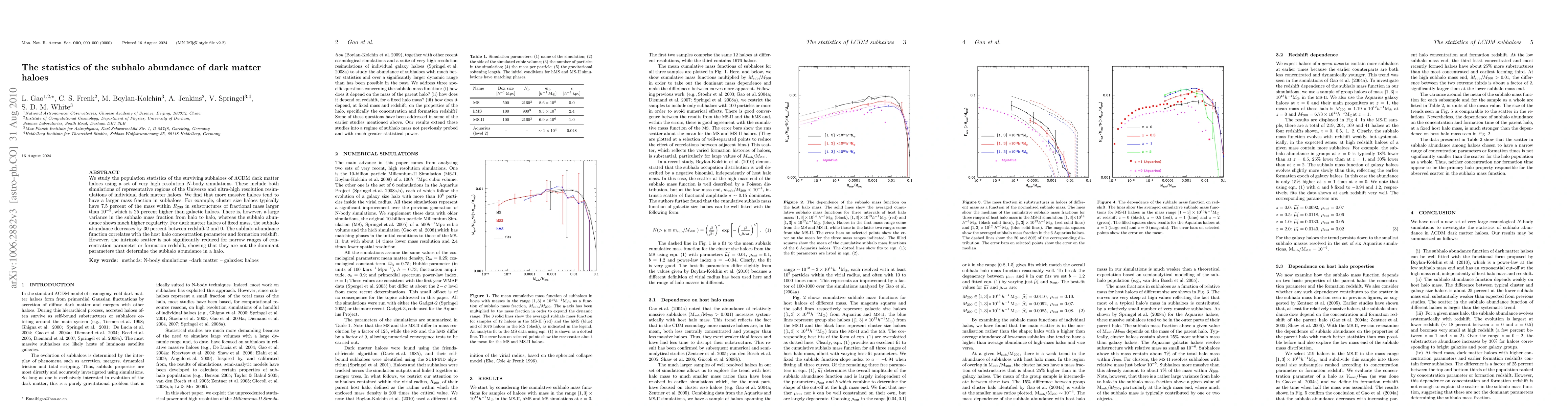 We study the population statistics of the surviving subhaloes of LCDM dark matter haloes using a set of very high resolution N-body simulations. These include both simulations of representative regions of the Universe and ultra-high resolution resimulations of individual dark matter haloes. We find that more massive haloes tend to have a larger mass fraction in subhaloes. For example, cluster size haloes typically have 7.5 percent of their mass within R200 in substructures of fractional mass larger than 1e-5, which is 25 percent higher than galactic haloes. There is, however, a large variance in the subhalo mass fraction from halo to halo, whereas the subhalo abundance shows much higher regularity. For dark matter haloes of fixed mass, the subhalo abundance decreases by 30 percent between redshift 2 and 0. The subhalo abundance function correlates with the host halo concentration parameter and formation redshift. However, the intrinsic scatter is not significantly reduced for narrow ranges of concentration parameter or formation redshift, showing that they are not the dominant parameters that determine the subhalo abundance in a halo.
