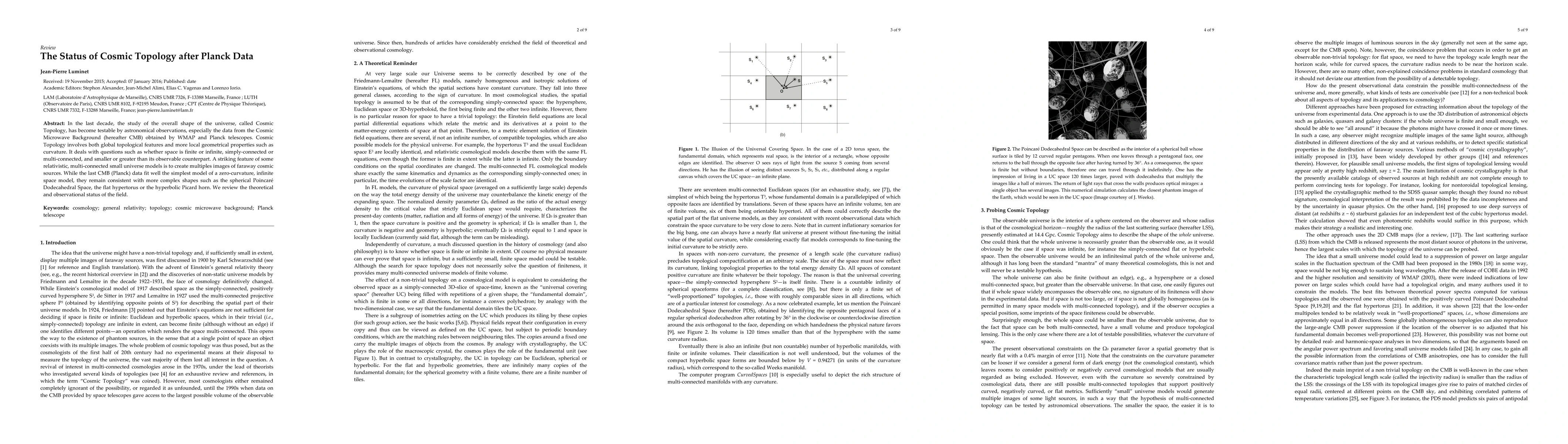 This paper reviews the current status of Cosmic Topology, focusing on the implications of recent Planck data for the shape of the universe. While the simplest model of infinite, zero-curvature space fits well, Planck data also remain consistent with more complex topologies like the Poincaré Dodecahedral Space.