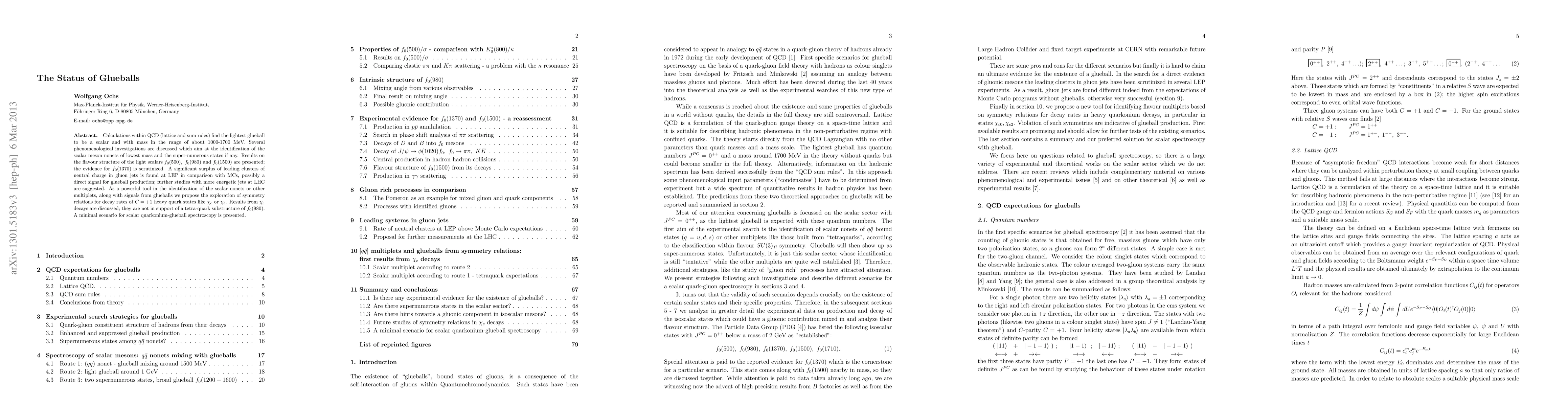 Calculations within QCD (lattice and sum rules) find the lightest glueball to be a scalar and with mass in the range of about 1000-1700 MeV. Several phenomenological investigations are discussed which aim at the identification of the scalar meson nonets of lowest mass and the super-numerous states if any. Results on the flavour structure of the light scalars f0(500), f0(980) and f0(1500) are presented; the evidence for f0(1370) is scrutinized. A significant surplus of leading clusters of neutral charge in gluon jets is found at LEP in comparison with MCs, possibly a direct signal for glueball production; further studies with more energetic jets at LHC are suggested. As a powerful tool in the identification of the scalar nonets or other multiplets, along with signals from glueballs we propose the exploration of symmetry relations for decay rates of C=+1 heavy quark states like chi-c or chi-b. Results from chi-c decays are discussed; they are not in support of a tetra-quark substructure of f0(980). A minimal scenario for scalar quarkonium - glueball spectroscopy is presented.