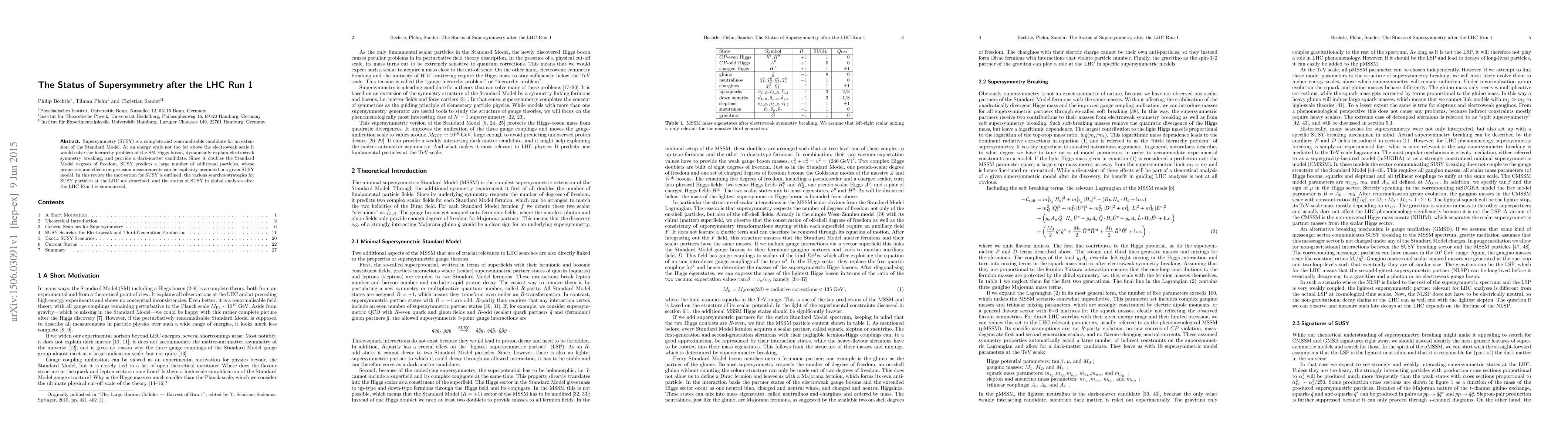 This paper reviews the motivation for Supersymmetry (SUSY) as an extension of the Standard Model, detailing its potential solutions to the hierarchy problem and its role in dark matter. It summarizes the search strategies for SUSY particles at the Large Hadron Collider (LHC) and assesses the current status of SUSY after the first run of the LHC.