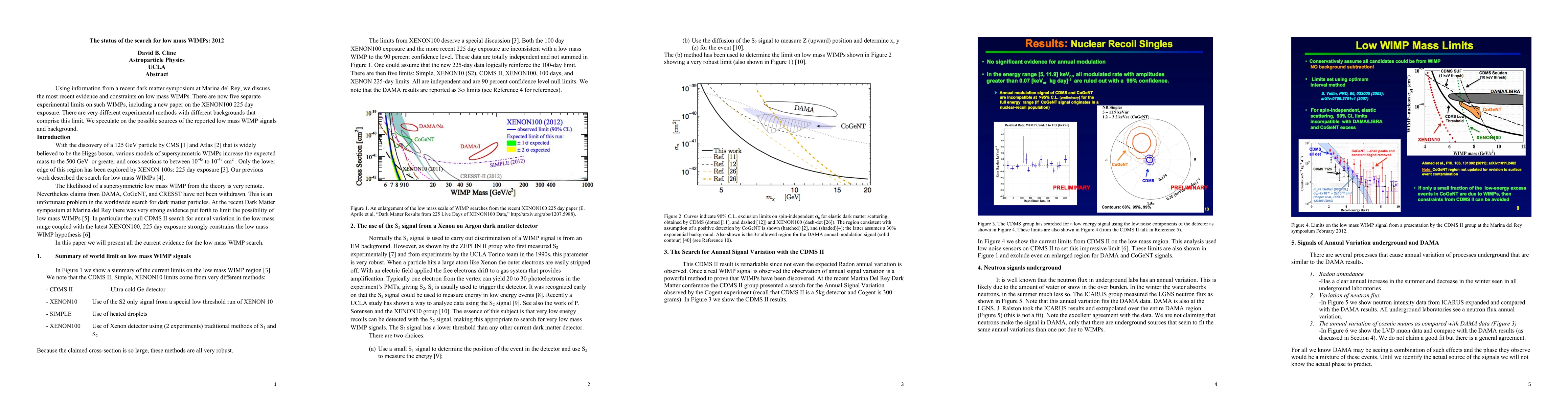 Using information from a recent dark matter symposium at Marina del Rey, we discuss the most recent evidence and constraints on low mass WIMPs. There are now five separate experimental limits on such WIMPs, including a new paper on the XENON100 225 day exposure. There are very different experimental methods with different backgrounds that comprise this limit. We speculate on the possible sources of the reported low mass WIMP signals and background.