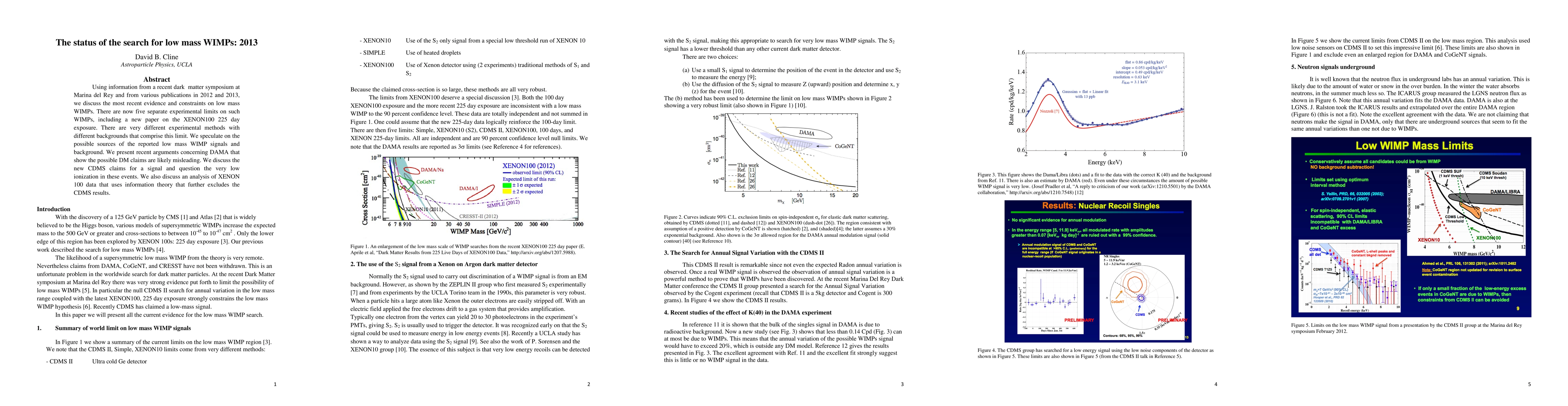 Using information from a recent dark matter symposium at Marina del Rey and from various publications in 2012 and 2013, we discuss the most recent evidence and constraints on low mass WIMPs. There are now five separate experimental limits on such WIMPs, including a new paper on the XENON100 225 day exposure. There are very different experimental methods with different backgrounds that comprise this limit. We speculate on the possible sources of the reported low mass WIMP signals and background. We present recent arguments concerning DAMA that show the possible DM claims are likely misleading. We discuss the new CDMS claims for a signal and question the very low ionization in these events. We also discuss an analysis of XENON 100 data that uses information theory that further excludes the CDMS results.