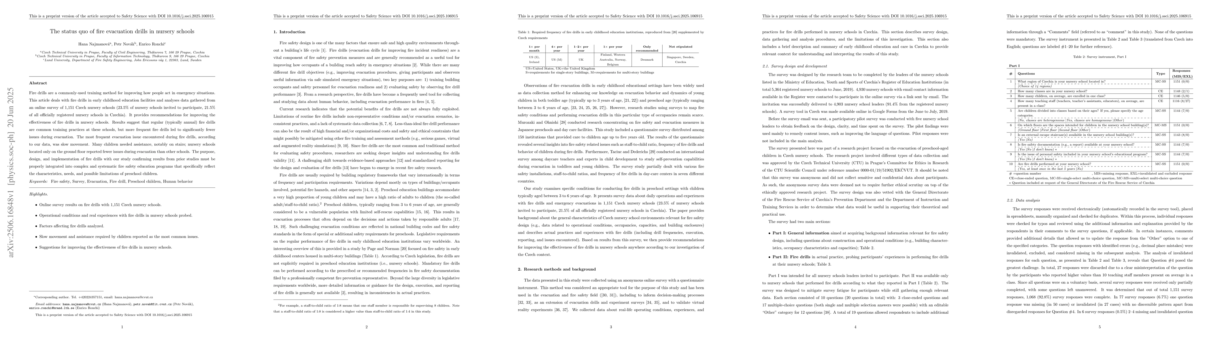 Fire drills are a commonly-used training method for improving how people act in emergency situations. This article deals with fire drills in early childhood education facilities and analyses data gathered from an online survey of 1151 Czech nursery schools (23.5% of nursery schools invited to participate, 21.5% of all officially registered nursery schools in Czechia). It provides recommendations for improving the effectiveness of fire drills in nursery schools. Results suggest that regular (typically annual) fire drills are common training practices at these schools, but more frequent fire drills led to significantly fewer issues during evacuation. The most frequent evacuation issue encountered during fire drills, according to our data, was slow movement. Many children needed assistance, notably on stairs; nursery schools located only on the ground floor reported fewer issues during evacuation than other schools. The purpose, design, and implementation of fire drills with our study confirming results from prior studies must be properly integrated into complex and systematic fire safety education programs that specifically reflect the characteristics, needs, and possible limitations of preschool children.