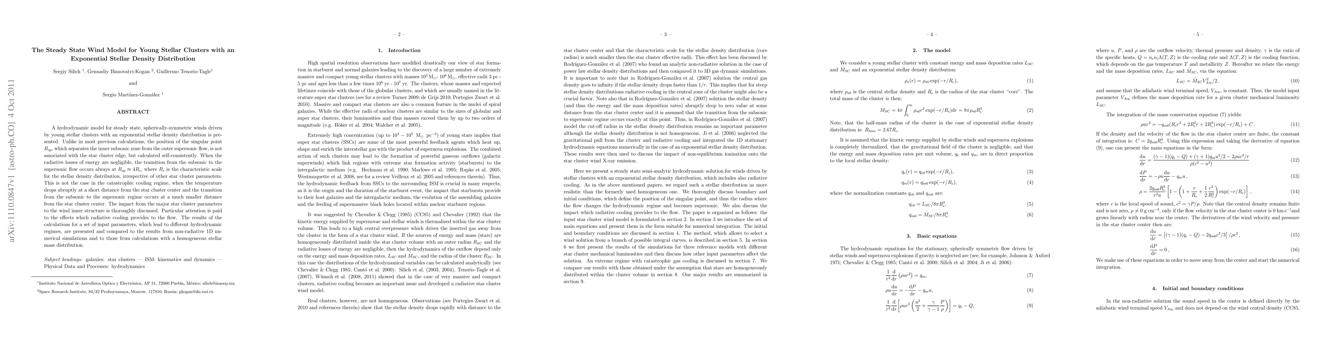 A hydrodynamic model for steady state, spherically-symmetric winds driven by young stellar clusters with an exponential stellar density distribution is presented. Unlike in most previous calculations, the position of the singular point R_sp, which separates the inner subsonic zone from the outer supersonic flow, is not associated with the star cluster edge, but calculated self-consistently. When the radiative losses of energy are negligible, the transition from the subsonic to the supersonic flow occurs always at R_sp ~ 4 R_c, where R_c is the characteristic scale for the stellar density distribution, irrespective of other star cluster parameters. This is not the case in the catastrophic cooling regime, when the temperature drops abruptly at a short distance from the star cluster center and the transition from the subsonic to the supersonic regime occurs at a much smaller distance from the star cluster center. The impact from the major star cluster parameters to the wind inner structure is thoroughly discussed. Particular attention is paid to the effects which radiative cooling provides to the flow. The results of the calculations for a set of input parameters, which lead to different hydrodynamic regimes, are presented and compared to the results from non-radiative 1D numerical simulations and to those from calculations with a homogeneous stellar mass distribution.