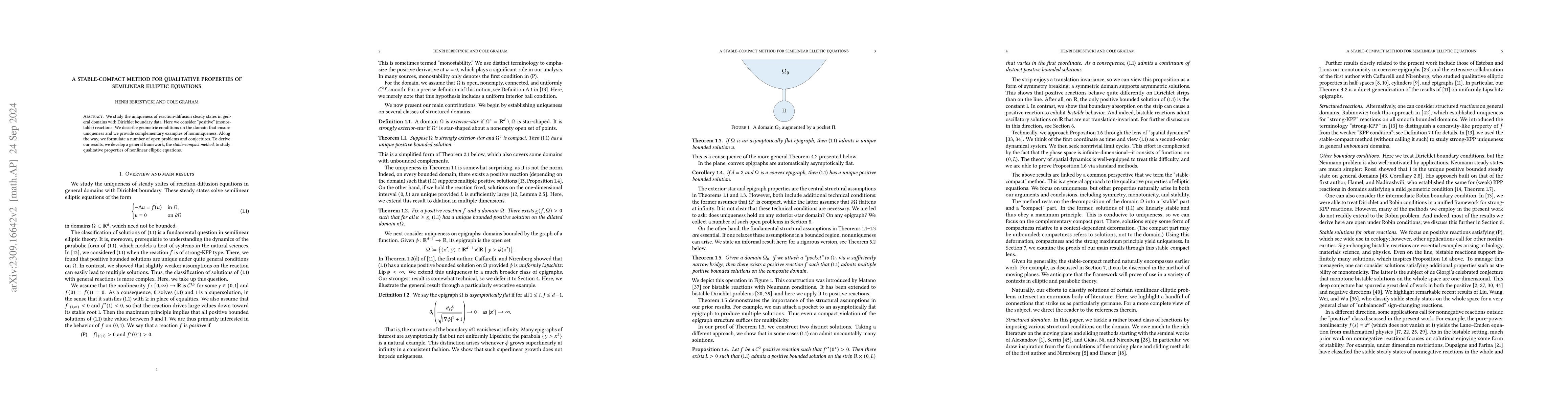We study the uniqueness of reaction-diffusion steady states in general domains with Dirichlet boundary data. Here we consider "positive" (monostable) reactions. We describe geometric conditions on the domain that ensure uniqueness and we provide complementary examples of nonuniqueness. Along the way, we formulate a number of open problems and conjectures. To derive our results, we develop a general framework, the stable-compact method, to study qualitative properties of nonlinear elliptic equations.