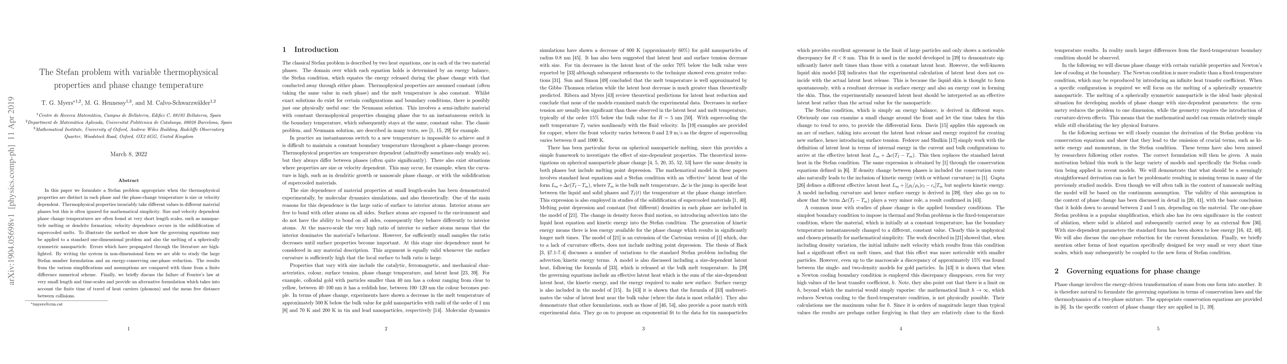In this paper we formulate a Stefan problem appropriate when the thermophysical properties are distinct in each phase and the phase-change temperature is size or velocity dependent. Thermophysical properties invariably take different values in different material phases but this is often ignored for mathematical simplicity. Size and velocity dependent phase change temperatures are often found at very short length scales, such as nanoparticle melting or dendrite formation; velocity dependence occurs in the solidification of supercooled melts. To illustrate the method we show how the governing equations may be applied to a standard one-dimensional problem and also the melting of a spherically symmetric nanoparticle. Errors which have propagated through the literature are highlighted. By writing the system in non-dimensional form we are able to study the large Stefan number formulation and an energy-conserving one-phase reduction. The results from the various simplifications and assumptions are compared with those from a finite difference numerical scheme. Finally, we briefly discuss the failure of Fourier's law at very small length and time-scales and provide an alternative formulation which takes into account the finite time of travel of heat carriers (phonons) and the mean free distance between collisions.