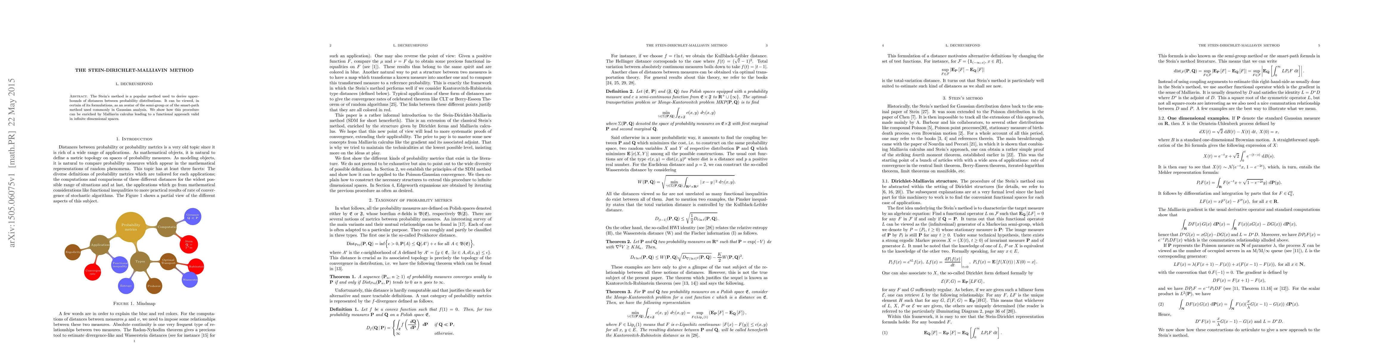 The Stein-Dirichlet-Malliavin method combines Stein's method with Malliavin calculus to derive upper-bounds of distances between probability distributions in infinite-dimensional spaces, offering a functional approach for rich mathematical insights.