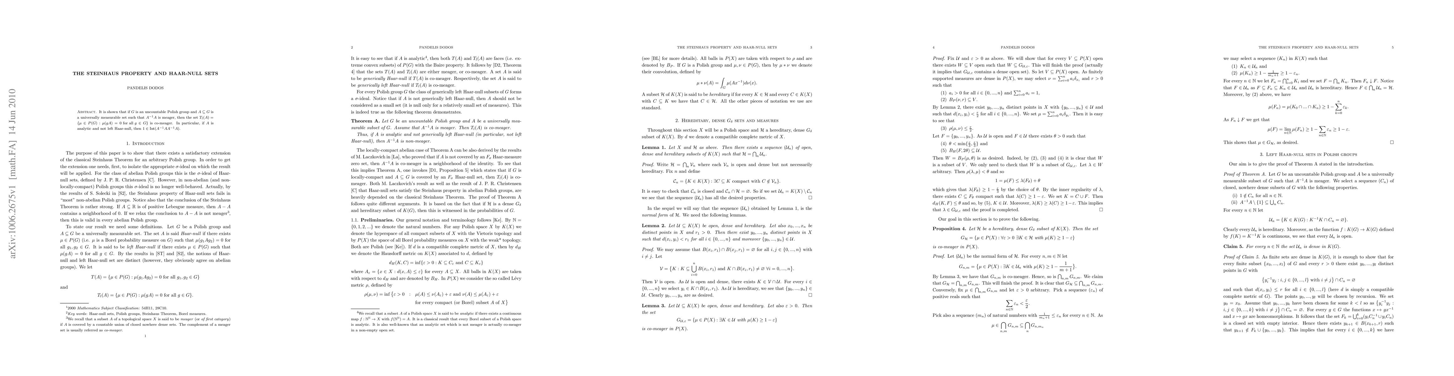 It is shown that if $G$ is an uncountable Polish group and $A\subseteq G$ is a universally measurable set such that $A^{-1}A$ is meager, then the set $T_l(A)=\{\mu\in P(G): \mu(gA)=0 \text{for all} g\in G\}$ is co-meager. In particular, if $A$ is analytic and not left Haar-null, then $1\in\mathrm{Int}(A^{-1}AA^{-1}A)$.