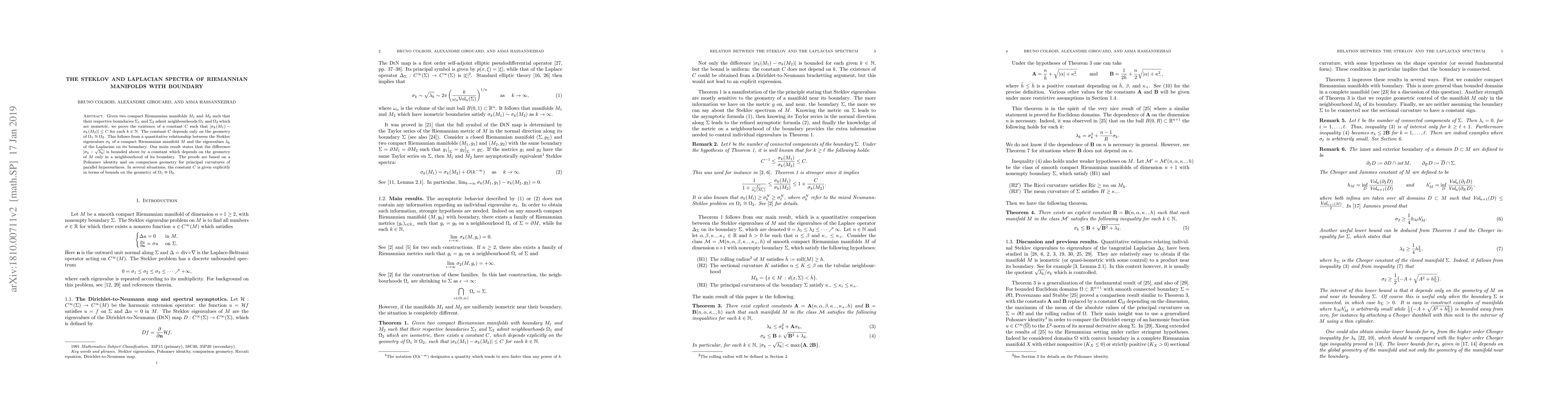Given two compact Riemannian manifolds with boundary $M_1$ and $M_2$ such that their respective boundaries $\Sigma_1$ and $\Sigma_2$ admit neighborhoods $\Omega_1$ and $\Omega_2$ which are isometric, we prove the existence of a constant $C$, which depends only on the geometry of $\Omega_1\cong\Omega_2$, such that $|\sigma_k(M_1)-\sigma_k(M_2)|\leq C$ for each $k\in\mathbb{N}$. This follows from a quantitative relationship between the Steklov eigenvalues $\sigma_k$ of a compact Riemannian manifold $M$ and the eigenvalues $\lambda_k$ of the Laplacian on its boundary. Our main result states that the difference $|\sigma_k-\sqrt{\lambda_k}|$ is bounded above by a constant which depends on the geometry of $M$ only in a neighborhood of its boundary. The proofs are based on a Pohozaev identity and on comparison geometry for principal curvatures of parallel hypersurfaces. In several situations, the constant $C$ is given explicitly in terms of bounds on the geometry of $\Omega_1\cong\Omega_2$.