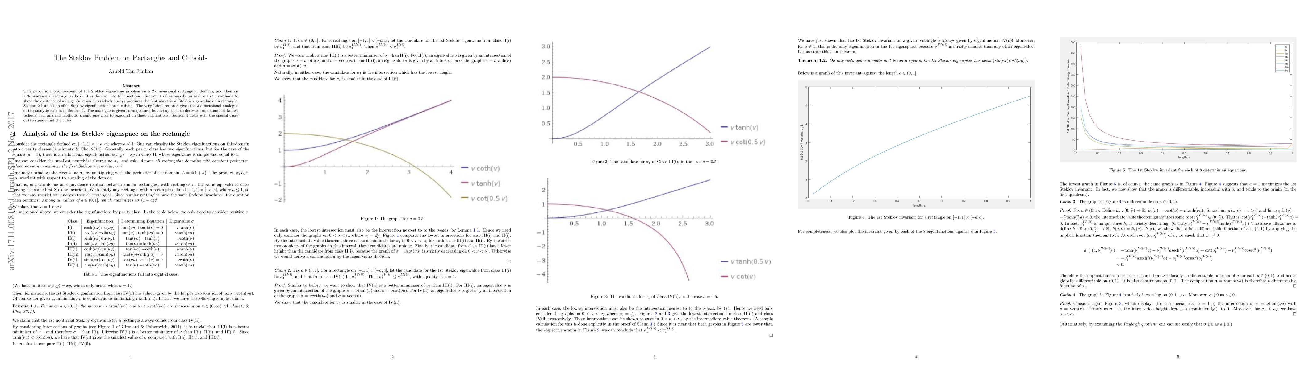 This paper is a brief account of the Steklov eigenvalue problem on a 2-dimensional rectangular domain, and then on a 3-dimensional rectangular box. It is divided into four sections. Section 1 relies heavily on real analytic methods to show the existence of an eigenfunction class which always produces the first non-trivial Steklov eigenvalue on a rectangle. Section 2 lists all possible Steklov eigenfunctions on a cuboid. The very brief section 3 gives the 3-dimensional analogue of the analytic results in Section 1. The analogue is given as conjecture, but is expected to derivate from standard (albeit tedious) real analysis methods, should one wish to expound on these calculations. Section 4 deals with the special cases of the square and the cube.