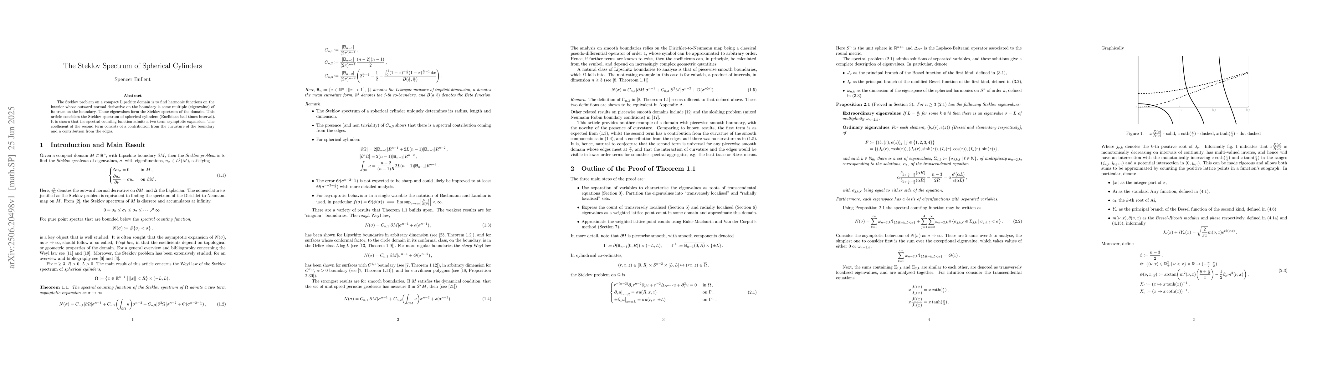 The Steklov problem on a compact Lipschitz domain is to find harmonic functions on the interior whose outward normal derivative on the boundary is some multiple (eigenvalue) of its trace on the boundary. These eigenvalues form the Steklov spectrum of the domain. This article considers the Steklov spectrum of spherical cylinders (Euclidean ball times interval). It is shown that the spectral counting function admits a two term asymptotic expansion. The coefficient of the second term consists of a contribution from the curvature of the boundary and a contribution from the edges.