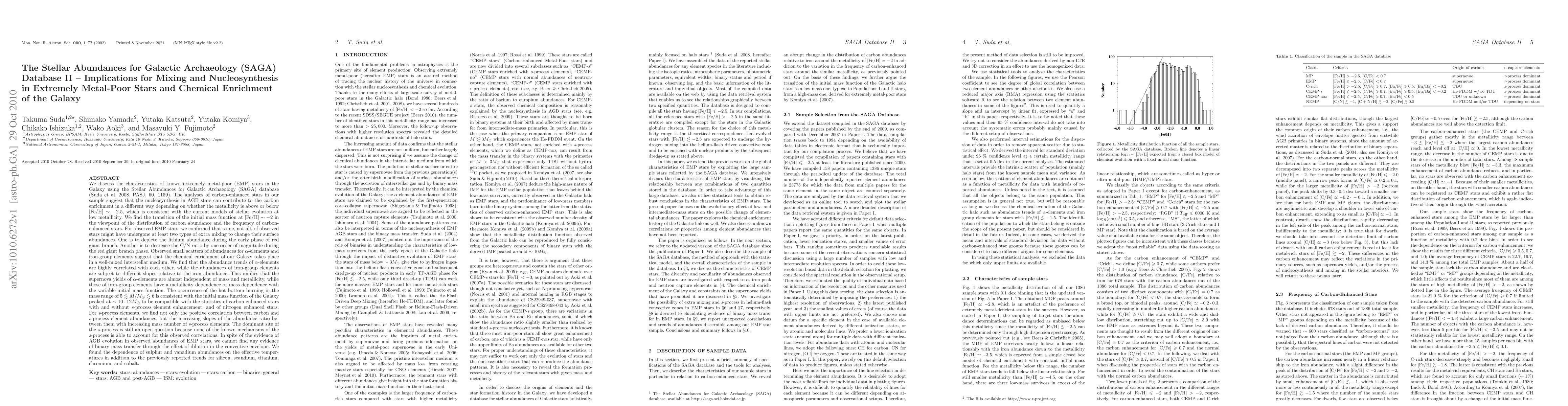 The SAGA database II examines extremely metal-poor stars, revealing that nucleosynthesis in AGB stars significantly impacts carbon enrichment differently above and below [Fe/H] ~ -2.5. The study also finds evidence of extra mixing processes in some stars, influencing surface abundances and suggesting a well-mixed interstellar medium.