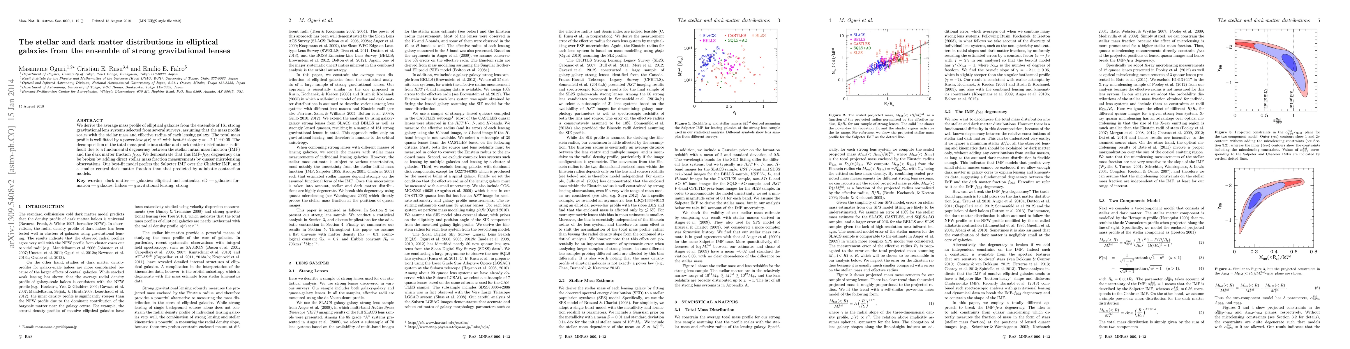 We derive the average mass profile of elliptical galaxies from the ensemble of 161 strong gravitational lens systems selected from several surveys, assuming that the mass profile scales with the stellar mass and effective radius of each lensing galaxy. The total mass profile is well fitted by a power-law \rho(r) \propto r^\gamma with best-fit slope \gamma = -2.11+/-0.05. The decomposition of the total mass profile into stellar and dark matter distributions is difficult due to a fundamental degeneracy between the stellar initial mass function (IMF) and the dark matter fraction f_DM. We demonstrate that this IMF-f_DM degeneracy can be broken by adding direct stellar mass fraction measurements by quasar microlensing observations. Our best-fit model prefers the Salpeter IMF over the Chabrier IMF, and a smaller central dark matter fraction than that predicted by adiabatic contraction models.