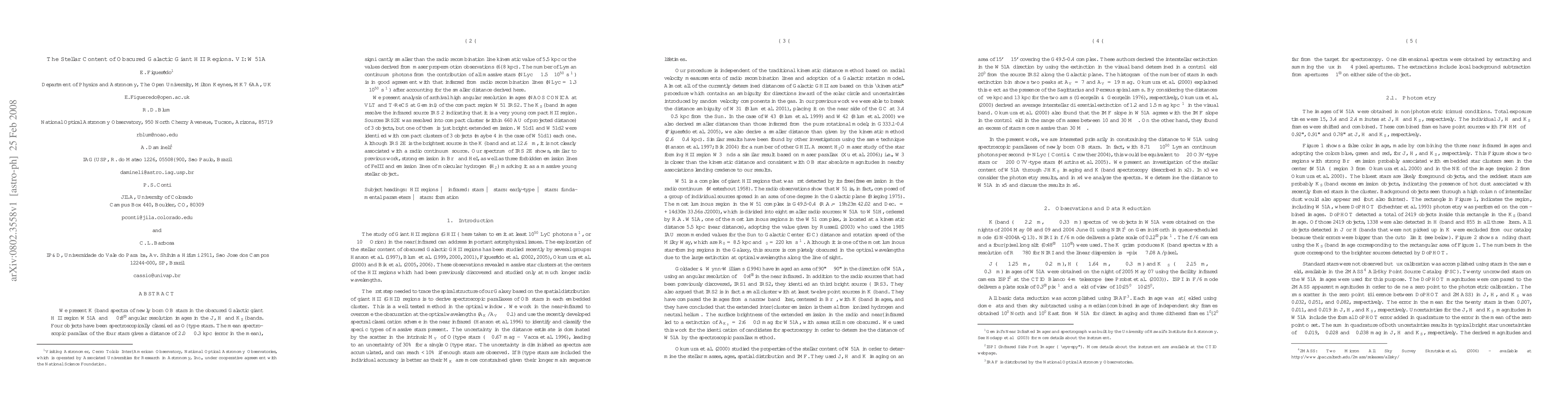 We present K-band spectra of newly born OB stars in the obscured Galactic giant H II region W51A and ~ 0.8'' angular resolution images in the J, H and K_S-bands. Four objects have been spectroscopically classified as O-type stars. The mean spectroscopic parallax of the four stars gives a distance of 2.0 \pm 0.3 kpc (error in the mean), significantly smaller than the radio recombination line kinematic value of 5.5 kpc or the values derived from maser propermotion observations (6--8 kpc). The number of Lyman continuum photons from the contribution of all massive stars (NLyc ~ 1.5 x 10^{50} s^{-1}) is in good agreement with that inferred from radio recombination lines (NLyc = 1.3 x 10^{50} s^{-1}) after accounting for the smaller distance derived here. We present analysis of archival high angular resolution images (NAOS CONICA at VLT and T-ReCS at Gemini) of the compact region W51 IRS2. The K_S--band images resolve the infrared source IRS~2 indicating that it is a very young compact HII region. Sources IRS2E was resolved into compact cluster (within 660 AU of projected distance) of 3 objects, but one of them is just bright extended emission. W51d1 and W51d2 were identified with compact clusters of 3 objects (maybe 4 in the case of W51d1) each one. Although IRS~2E is the brightest source in the K-band and at 12.6 \micron, it is not clearly associated with a radio continuum source. Our spectrum of IRS~2E shows, similar to previous work, strong emission in Br$\gamma$ and HeI, as well as three forbidden emission lines of FeIII and emission lines of molecular hydrogen (H_2) marking it as a massive young stellar object.