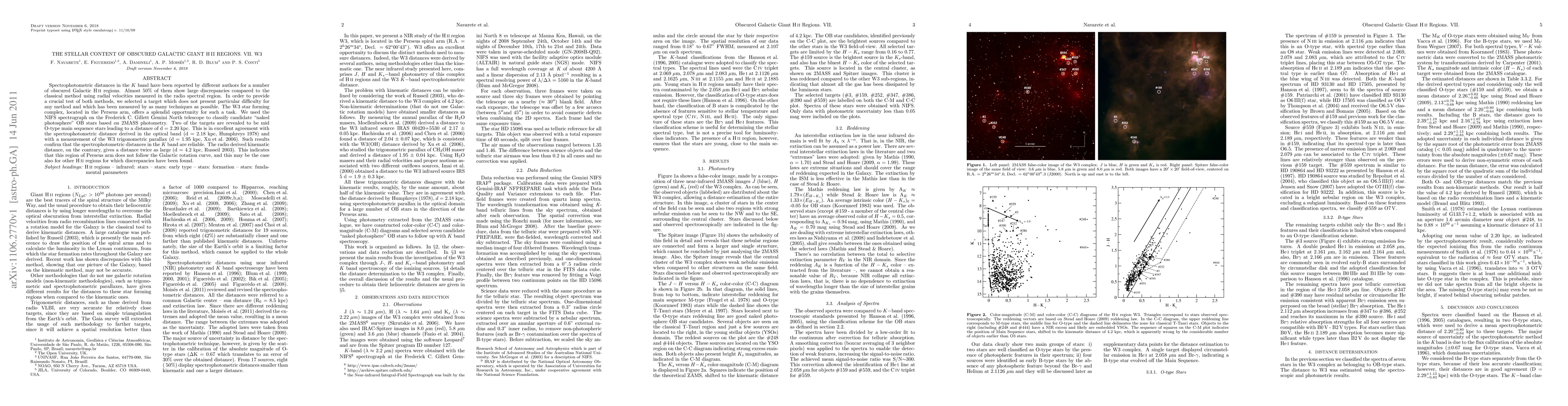 Spectrophotometric distances in the K band have been reported by different authors for a number of obscured Galactic HII regions. Almost 50% of them show large discrepancies compared to the classical method using radial velocities measured in the radio spectral region. In order to provide a crucial test of both methods, we selected a target which does not present particular difficulty for any method and which has been measured by as many techniques as possible. The W3 star forming complex, located in the Perseus arm, offers a splendid opportunity for such a task. We used the NIFS spectrograph on the Frederick C. Gillett Gemini North telescope to classify candidate "naked photosphere" OB stars based on 2MASS photometry. Two of the targets are revealed to be mid O-type main sequence stars leading to a distance of d = 2.20 kpc. This is in excellent agreement with the spectrophotometric distance derived in the optical band (d = 2.18 kpc, Humphreys 1978) and with a measurement of the W3 trigonometric parallax (d = 1.95 kpc, Xu et al. 2006). Such results confirm that the spectrophotometric distances in the K band are reliable. The radio derived kinematic distance, on the contrary, gives a distance twice as large (d = 4.2 kpc, Russeil 2003). This indicates that this region of Perseus arm does not follow the Galactic rotation curve, and this may be the case also for other HII regions for which discrepancies have been found.