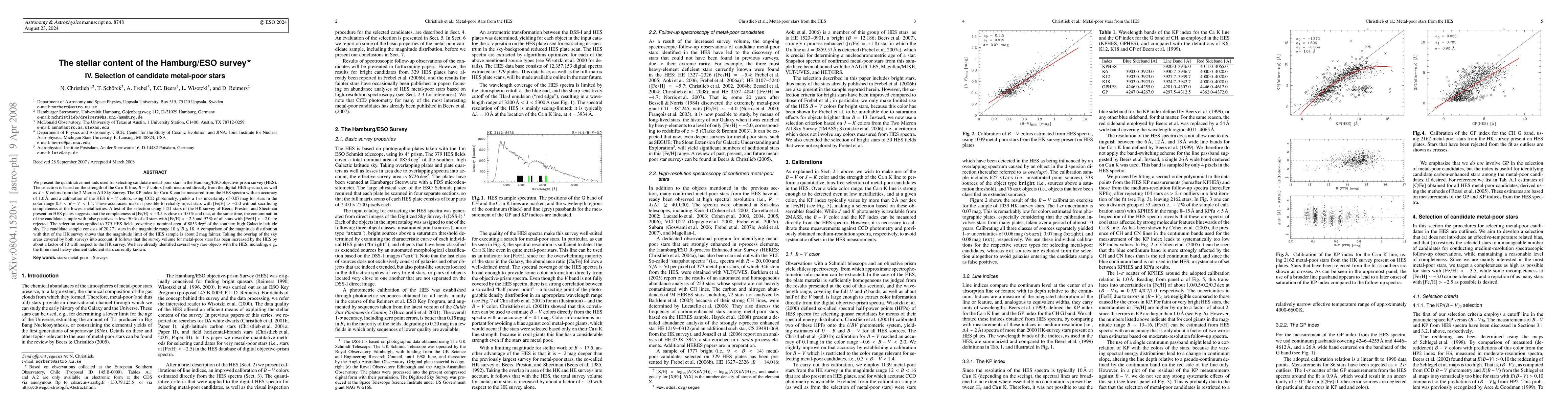 We present the quantitative methods used for selecting candidate metal-poor stars in the Hamburg/ESO objective-prism survey (HES). The selection is based on the strength of the Ca II K line, B-V colors (both measured directly from the digital HES spectra), as well as J-K colors from the 2 Micron All Sky Survey. The KP index for Ca II K can be measured from the HES spectra with an accuracy of 1.0 Angstrom, and a calibration of the HES B-V colors, using CCD photometry, yields a 1-sigma uncertainty of 0.07 mag for stars in the color range 0.3 < B-V < 1.4. These accuracies make it possible to reliably reject stars with [Fe/H] > -2.0 without sacrificing completeness at the lowest metallicities. A test of the selection using 1121 stars of the HK survey of Beers, Preston, and Shectman present on HES plates suggests that the completeness at [Fe/H] < -3.5 is close to 100% and that, at the same time, the contamination of the candidate sample with false positives is low: 50% of all stars with [Fe/H] > -2.5 and 97% of all stars with [Fe/H] > -2.0 are rejected. The selection was applied to 379 HES fields, covering a nominal area of 8853 square degrees of the southern high Galactic latitude sky. The candidate sample consists of 20,271 stars in the magnitude range 10 < B < 18. A comparison of the magnitude distribution with that of the HK survey shows that the magnitude limit of the HES sample is about 2 mag fainter. Taking the overlap of the sky areas covered by both surveys into account, it follows that the survey volume for metal-poor stars has been increased by the HES by about a factor of 10 with respect to the HK survey. We have already identified several very rare objects with the HES, including, e.g., the three most heavy-element deficient stars currently known.