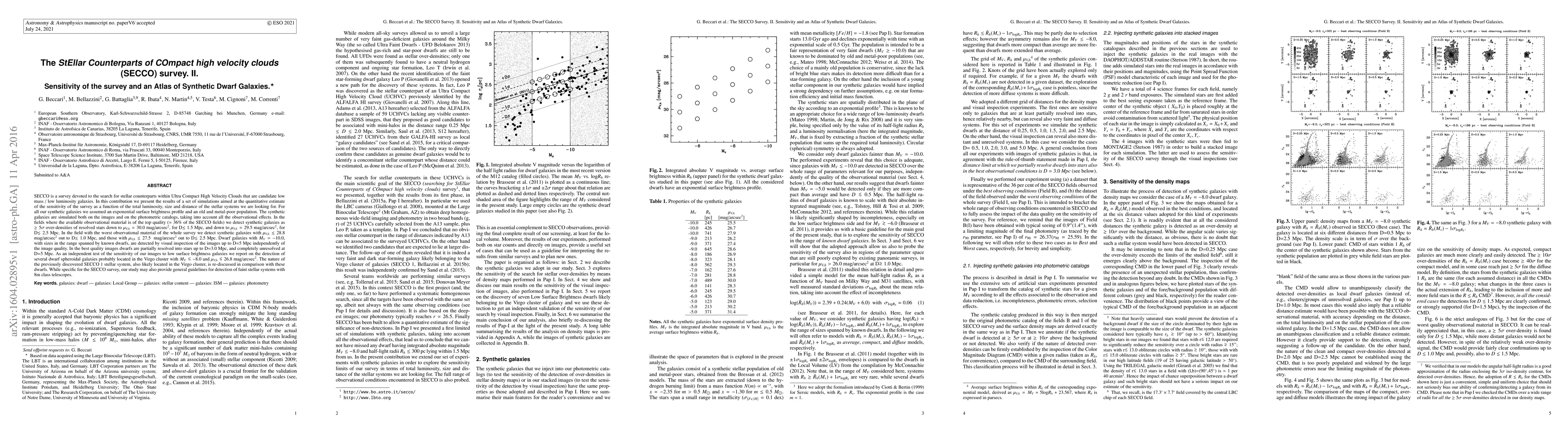 SECCO is a survey devoted to the search for stellar counterparts within Ultra Compact High Velocity Clouds. In this contribution we present the results of a set of simulations aimed at the quantitative estimate of the sensitivity of the survey as a function of the total luminosity, size and distance of the stellar systems we are looking for. For all our synthetic galaxies we assumed an exponential surface brightness profile and an old and metal-poor population. The synthetic galaxies are simulated both on the images and on the photometric catalogs, taking into account all the observational effects. In the fields where the available observational material is of the top quality we detect synthetic galaxies as >=5 sigma over-densities of resolved stars down to muV,h=30.0 mag/arcsec2, for D<=1.5 Mpc, and down to muV,h~29.5 mag/arcsec2, for D<=2.5 Mpc. In the field with the worst observational material of the whole survey we detect synthetic galaxies with muV,h<=28.8 mag/arcsec2 out to D<=1.0 Mpc, and those with muV,h<=27.5 mag/arcsec2 out to D<=2.5 Mpc. Dwarf galaxies with MV=-10, with sizes in the range spanned by known dwarfs, are detected by visual inspection of the images up to D=5 Mpc independently of the image quality. In the best quality images dwarfs are partially resolved into stars up to D=3.0 Mpc, and completely unresolved at D=5 Mpc. As an independent test of the sensitivity of our images to low surface brightness galaxies we report on the detection of several dwarf spheroidal galaxies probably located in the Virgo cluster with MV<=-8.0 and muV,h<=26.8 mag/arcsec2. The nature of the previously discovered SECCO 1 stellar system, also likely located in the Virgo cluster, is re-discussed in comparison with these dwarfs. While specific for the SECCO survey, our study may also provide general guidelines for detection of faint stellar systems with 8m class telescopes.