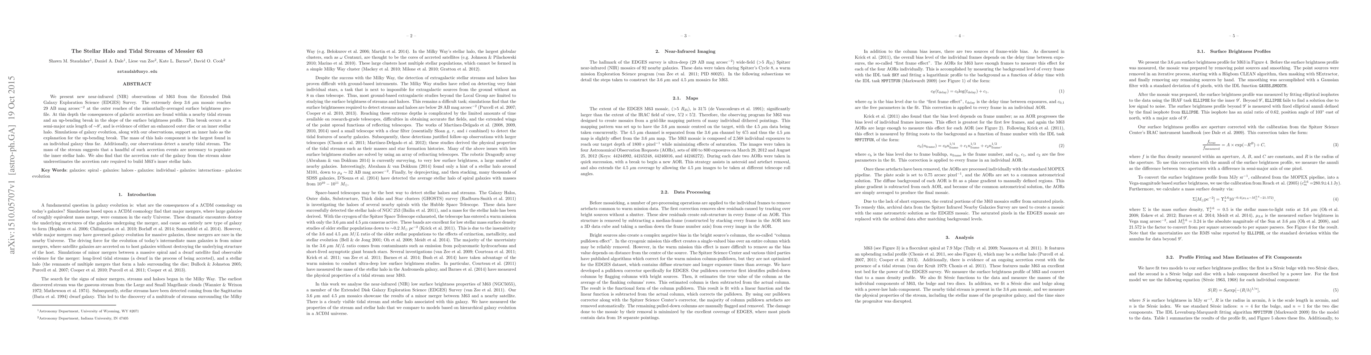 We present new near-infrared (NIR) observations of M63 from the Extended Disk Galaxy Exploration Science (EDGES) Survey. The extremely deep 3.6 $\mu$m mosaic reaches 29 AB mag arcsec$^{-2}$ at the outer reaches of the azimuthally-averaged surface brightness profile. At this depth the consequences of galactic accretion are found within a nearby tidal stream and an up-bending break in the slope of the surface brightness profile. This break occurs at a semi-major axis length of $\sim$8', and is evidence of either an enhanced outer disc or an inner stellar halo. Simulations of galaxy evolution, along with our observations, support an inner halo as the explanation for the up-bending break. The mass of this halo component is the largest found in an individual galaxy thus far. Additionally, our observations detect a nearby tidal stream. The mass of the stream suggests that a handful of such accretion events are necessary to populate the inner stellar halo. We also find that the accretion rate of the galaxy from the stream alone underestimates the accretion rate required to build M63's inner stellar halo.