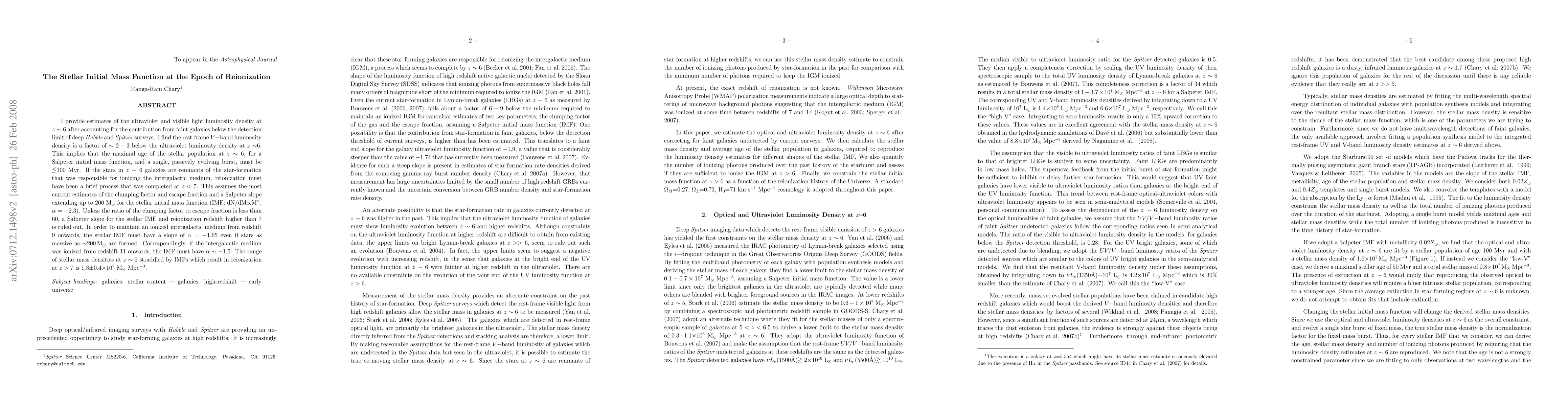 I provide estimates of the ultraviolet and visible light luminosity density at z~6 after accounting for the contribution from faint galaxies below the detection limit of deep Hubble and Spitzer surveys. I find the rest-frame V-band luminosity density is a factor of ~2-3 below the ultraviolet luminosity density at z~6. This implies that the maximal age of the stellar population at z~6, for a Salpeter initial mass function, and a single, passively evolving burst, must be <100 Myr. If the stars in z~6 galaxies are remnants of the star-formation that was responsible for ionizing the intergalactic medium, reionization must have been a brief process that was completed at z<7. This assumes the most current estimates of the clumping factor and escape fraction and a Salpeter slope extending up to 200 M_{\sun} for the stellar initial mass function (IMF; dN/dM \propto M^{\alpha}, \alpha=-2.3). Unless the ratio of the clumping factor to escape fraction is less than 60, a Salpeter slope for the stellar IMF and reionization redshift higher than 7 is ruled out. In order to maintain an ionized intergalactic medium from redshift 9 onwards, the stellar IMF must have a slope of \alpha=-1.65 even if stars as massive as ~200 M_{\sun} are formed. Correspondingly, if the intergalactic medium was ionized from redshift 11 onwards, the IMF must have \alpha~-1.5. The range of stellar mass densities at z~6 straddled by IMFs which result in reionization at z>7 is 1.3+/-0.4\times10^{7} Msun/Mpc^3.