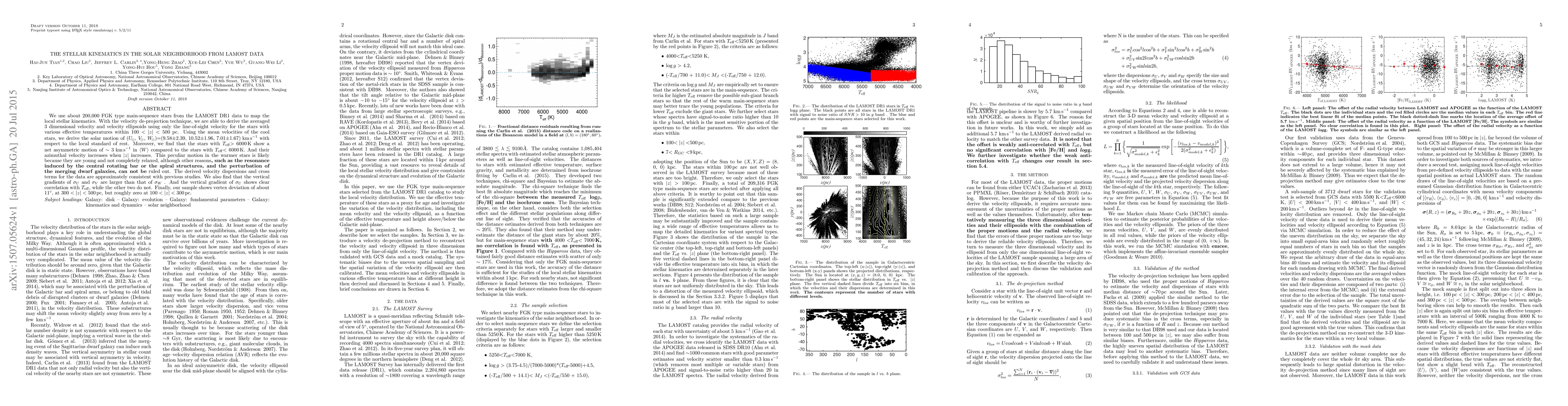 We use about 200,000 FGK type main-sequence stars from the LAMOST DR1 data to map the local stellar kinematics. With the velocity de-projection technique, we are able to derive the averaged 3 dimensional velocity and velocity ellipsoids using only the line-of-sight velocity for the stars with various effective temperatures within $100 < |z| < 500$ pc. Using the mean velocities of the cool stars, we derive the solar motion of ($U_{\!\odot}$, $V_{\!\odot}$, $W_{\!\odot}$)=(9.58$\pm2.39$, 10.52$\pm1.96$, 7.01$\pm1.67$)$km\,s^{-1}$ with respect to the local standard of rest. Moreover, we find that the stars with ${T}_{\rm eff}>6000$K show a net asymmetric motion of $\sim3 km\,s^{-1}$ in $\langle W\rangle$ compared to the stars with ${T}_{\rm eff}<6000$K. And their azimuthal velocity increases when $|z|$ increases. This peculiar motion in the warmer stars is likely because they are young and not completely relaxed, although other reasons, such as the resonance induced by the central rotating bar or the spiral structures, and the perturbation of the merging dwarf galaxies, can not be ruled out. The derived velocity dispersions and cross terms for the data are approximately consistent with previous studies. We also find that the vertical gradients of $\sigma_{U}$ and $\sigma_V$ are larger than that of $\sigma_W$ . And the vertical gradient of $\sigma_U$ shows clear correlation with ${T}_{\rm eff}$, while the other two do not. Finally, our sample shows vertex deviation of about 11$^\circ$, at $300 < |z| < 500$pc, but roughly zero at $100 < |z| < 300$pc.