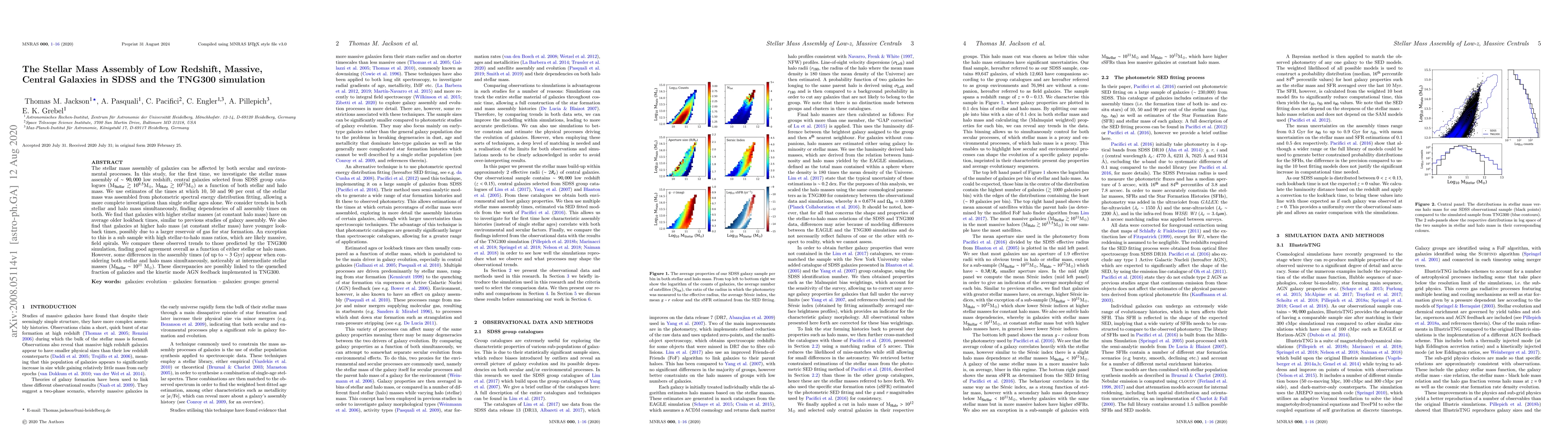 This study investigates the stellar mass assembly of low-redshift, massive central galaxies from SDSS data, finding that higher stellar mass galaxies have older assembly times, while higher halo mass galaxies have younger times. Comparisons with the TNG300 simulation show good overall agreement, but discrepancies in assembly times emerge at intermediate stellar masses, potentially due to AGN feedback mechanisms.