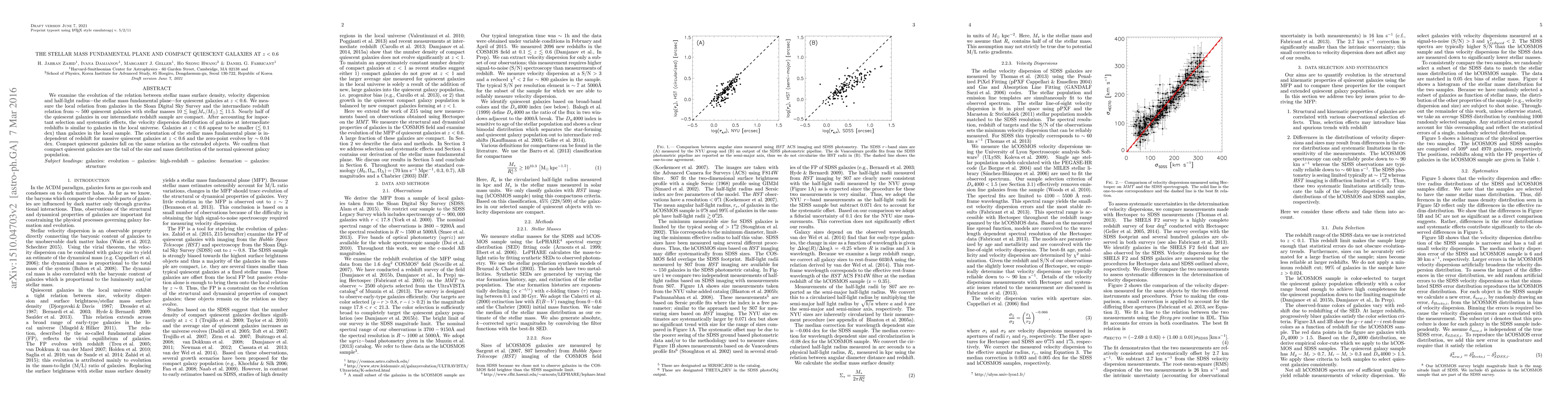This paper investigates the stellar mass fundamental plane for quiescent galaxies at $z<0.6$, finding that galaxies at intermediate redshifts have similar velocity dispersion distributions compared to local galaxies but are smaller in size. Compact quiescent galaxies follow the same fundamental plane as their extended counterparts, indicating they are part of the normal size and mass distribution.