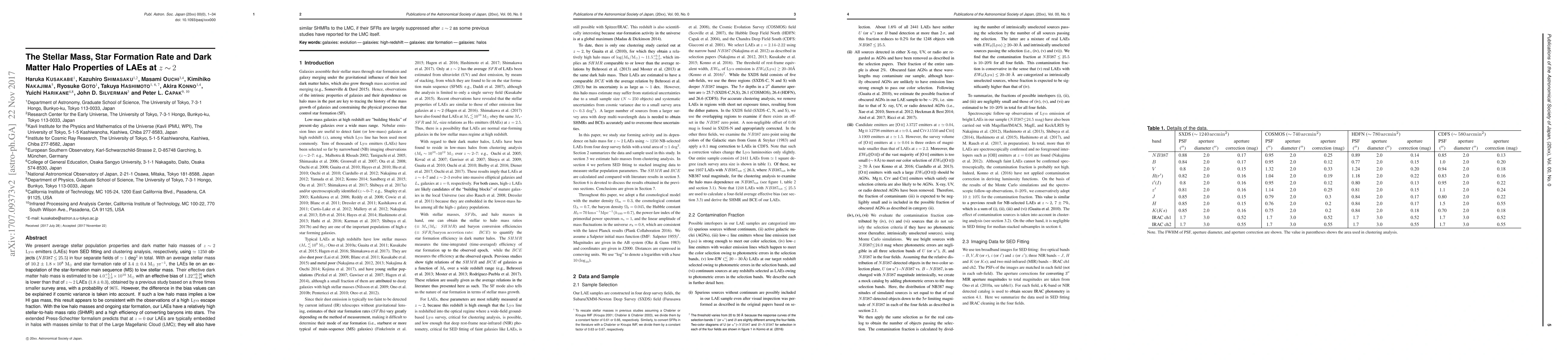 This paper investigates the stellar mass, star formation rate, and dark matter halo properties of $z \sim 2$ LAEs, finding an average stellar mass of $10.2 \times 10^8\, \mathrm{M_\odot}$ and a dark matter halo mass of $4.0 \times 10^{10}\, \mathrm{M_\odot}$, suggesting a high efficiency of star formation relative to their halo mass.